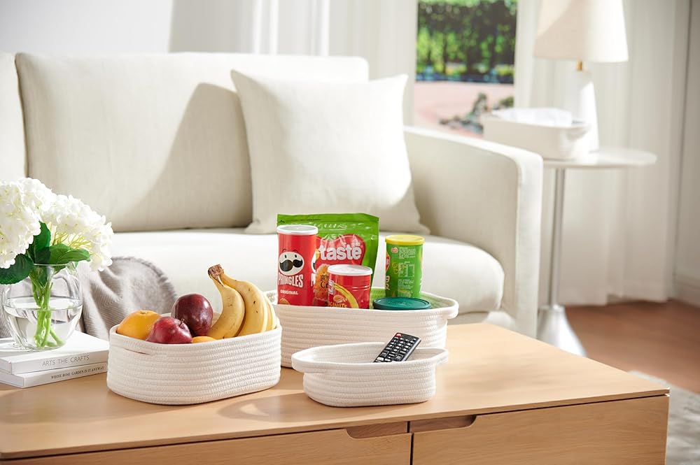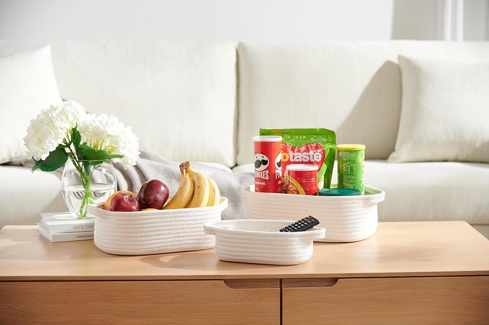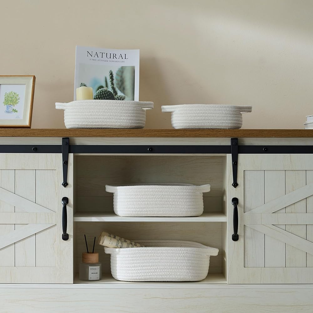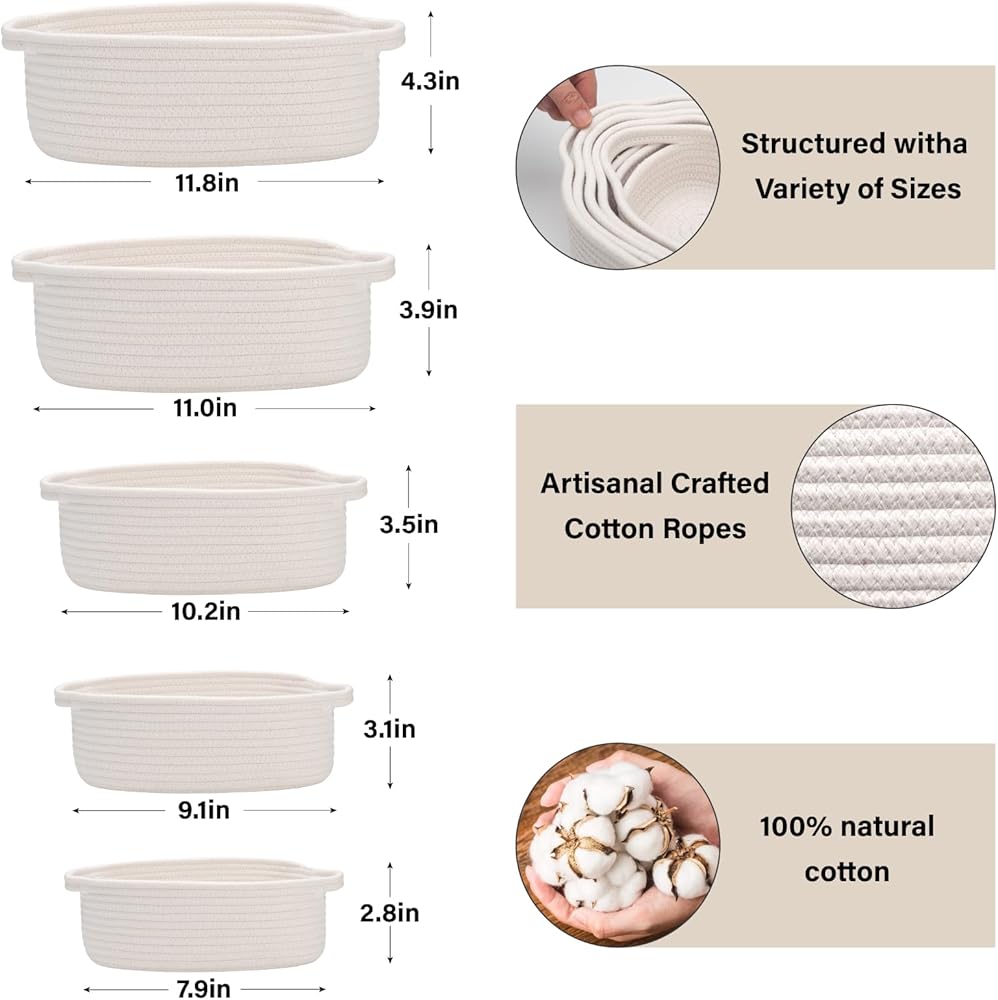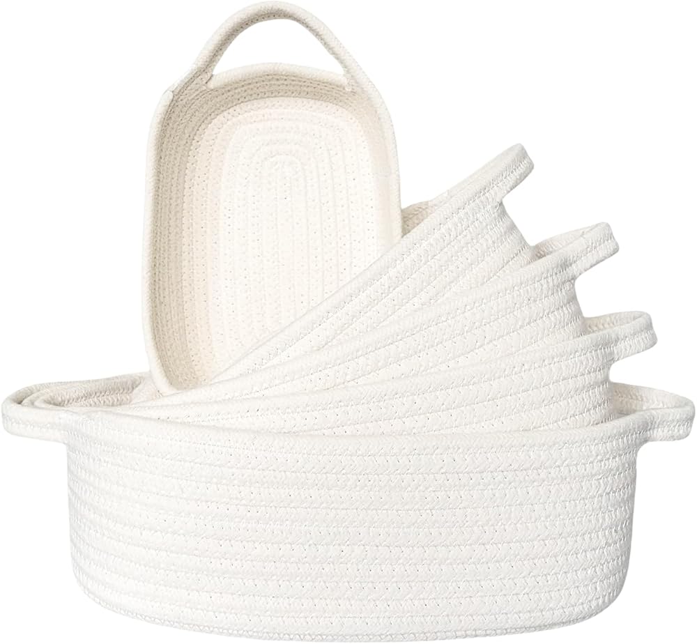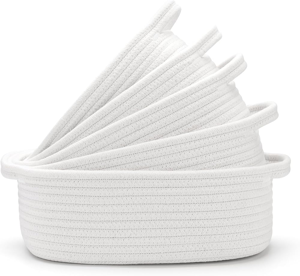 5-Piece Rectangle Storage Basket Set- Natural Cotton Rope Woven Baskets for Organizing! Small Basket for Montessori, Baby Nursery, Dog Toy Baskets, Cat Toy Box, Bathroom Organization Bin- White