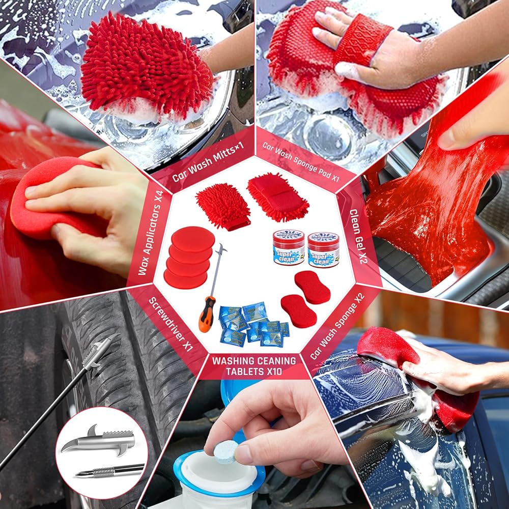 INTERIOR & EXTERIOR CLEANING - Upgraded red car cleaning gel has strong adsorption power can be used in conjunction with a duster to remove dust on the surface of the car. With its 180° swivel head and extra long handle, this car windscreen washer is ideal for cleaning high spots and the edges of windows. 5 detailing brushes and other types of brushes are available for all your car detailing or cleaning needs. This car wash kit Including almost everything car washing popular and useful items.