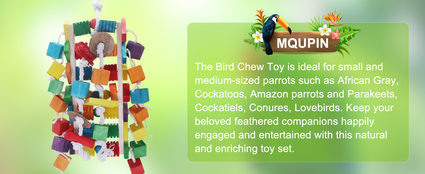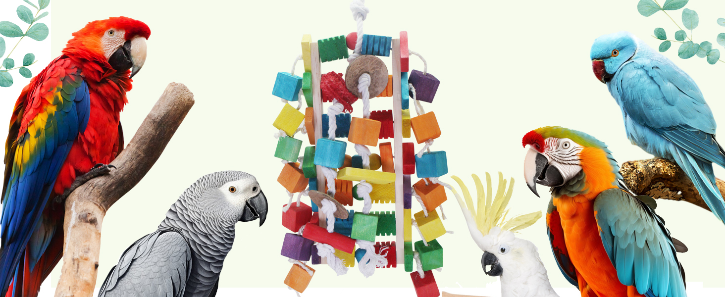 Best Gifts For Your Parrot: Great chewing and preening parrot toys to kill time and give dental care to your beloved birds. The color is bright and vivid, which is a beautiful decor to hang on the cage or wall at home.
