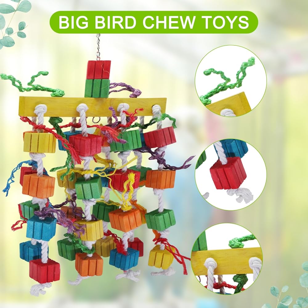 Parrot Toys, Bird Chewing Toy of Natural Multi-Colored Wooden Blocks, Cage Bite Toy Suits for African Grey Cockatoos Amazon Parrots Ect Large Medium Parrot Birds