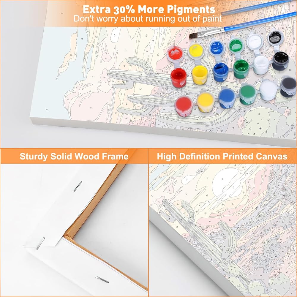 SOLID WOOD FRAME: The Paint by numbers comes with a solid wood frame. The Paint by numbers kit for adults canvas will not be folded during transportation and storage, so there will be no creases on the pre drawn canvas, giving you a better painting experience.