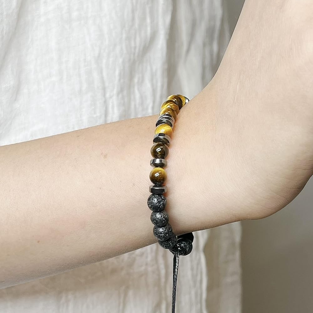 MATERIALS:Three natural gemstones, tiger eye stone, lava stone and hematite, combine into a triple protection bracelet with powerful energy. Handwoven with sturdy nylon rope. It will not tarnish, fracture or fade.