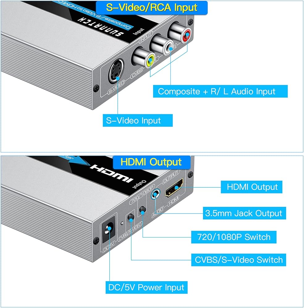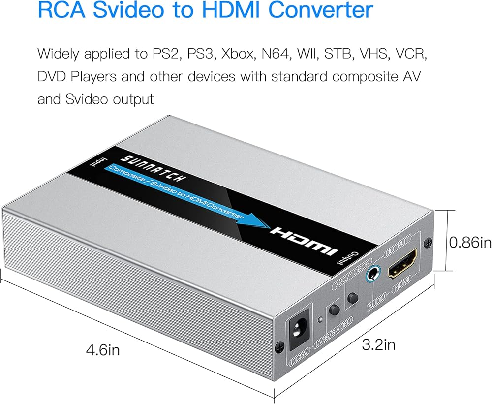 SUNNATCH RCA Svideo to HDMI converter gives your old devices a second life, it converts Composite or S-video +R / L audio signals into HDMI signals so you can watch your standard definition videos on a modern TV with HDMI input ports.