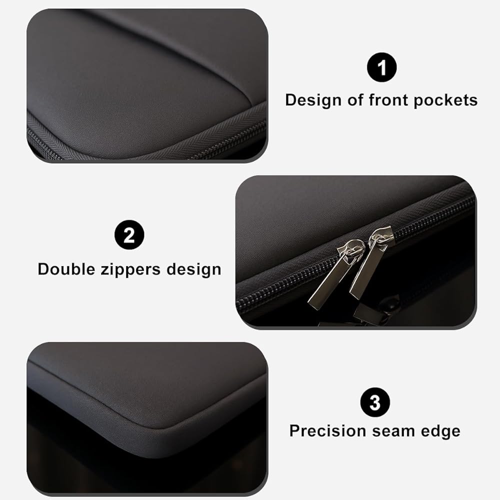 【Design of zippers & Pockets】There are 2 zippered pockets:① the large pocket can store your laptop, tablet; ② the small pocket can store some accessories: mouse, mouse pad, earphone, charger etc. Zippers design protects your laptop from sliding out of the sleeve case