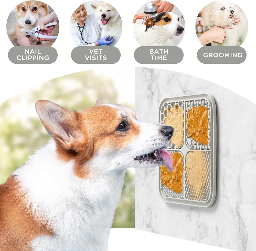 🐶🐱【Reduces Anxiety】:This Licking mat you could stick on any smooth surface, such as bathtub, counter, glass, ceramic tile, and the wall of bathroom to help calm your pets, The dog treat mat is great for stressful times such vet visits, bath time, nail clipping, injury recovery as well as thunderstorms and fireworks.