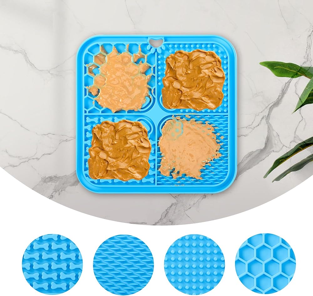 🐶🐱【Slow Feeding And Improves Digestion】Four different textured surfaces design is prefect for spreadable treats, such as cream cheese, yoghurt, peanut butter and so on. which provide dental care and improves health digestion effectively. This feeding mat is an ideal size for cats, puppies, small meduim and large dogs.