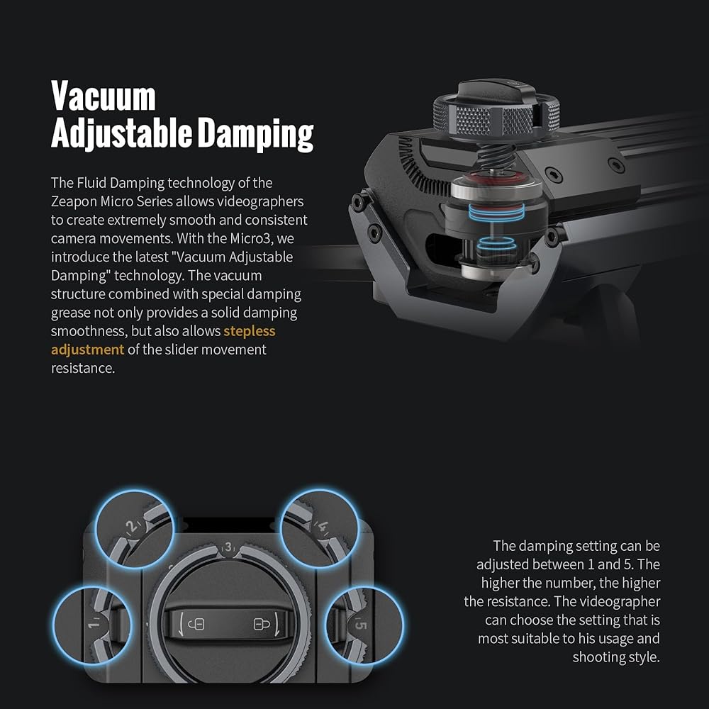 📸Vacuum Adjustable Damping: The Fluid Damping technology allows videographers to create extremely smooth and consistent camera movements. The vacuum structure combined with special damping grease not only provides a solid damping smoothness but also allows stepless adjustment of the slider movement resistance. The damping setting can be adjusted between 1 and 5. The higher the number, the higher the resistance. The Adjustable Damping technology also solves the problem of high resistance caused by extremely low temperatures.