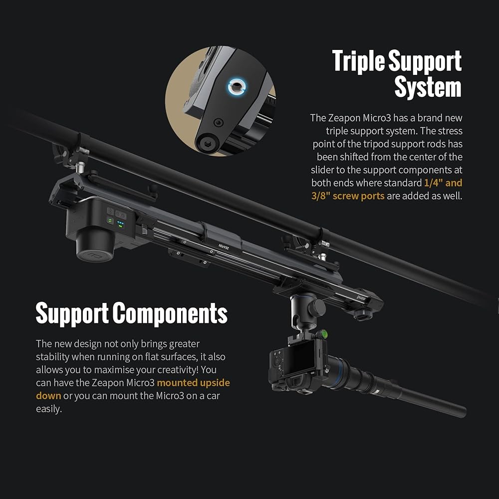 📸Triple Support System: With standard 1/4" and 3/8" screw ports added to both sides of the slider, you can have the Zeapon Micro3 mounted upside down or you can mount the Micro3 on a car easily. The entire Micro3 Series sliders come with tripod support rods, no need to purchase them separately, prevent the slider from tilting when moving to the end.