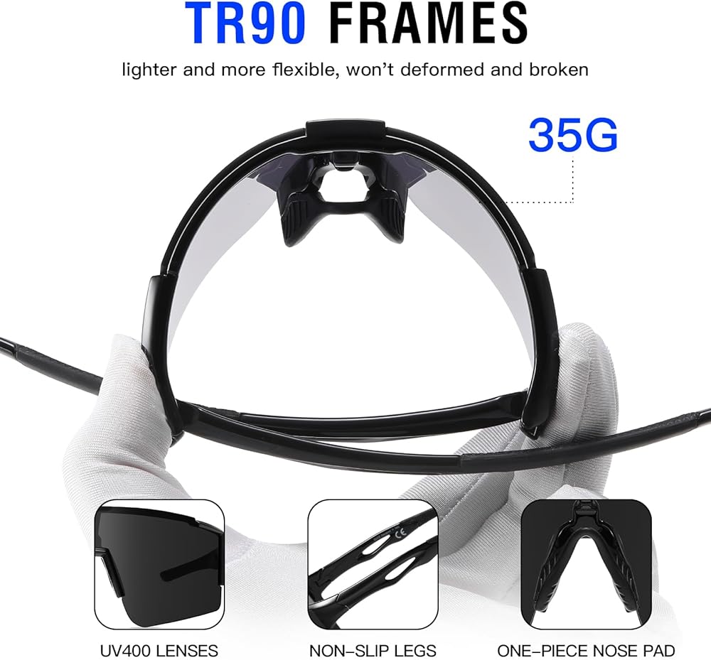 【LIGHTWEIGHT & COMFORTABLE】- Ultralight UV protective goggles reduce the pressure while outdoor activities. Solid 3-point support with slip-resistant rubber nose pad and frame leg , fit your face better. TR90 frame are impact resistant, scratch resistant, flexible, durable and unbreakable. It is so effective at preventing damage to the eyes and face caused by breaking the frame in motion that you can barely feel its weight once you start wearing it.