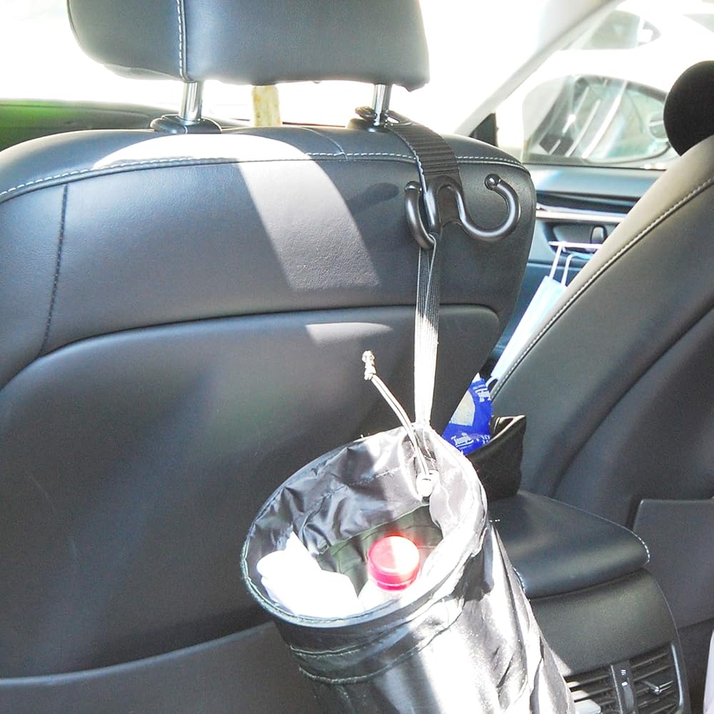 Hang from headrest with hook or secure to floor mat with bottom loop tab. Avoid rolling or spilling out when a sudden stop.