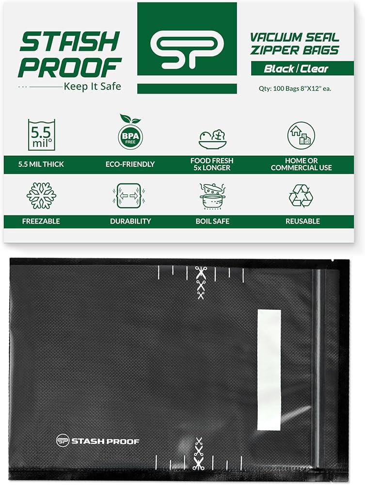 Stash Proof Resealable Zipper Vacuum Seal Bags 8" x 12" (100 Count) 5.5 Mil (Black and Clear) - BPA Free Commerical Grade Food Saver for Storage, Sous Vide, and Meal Prep Sealer Bag