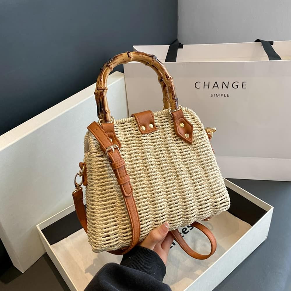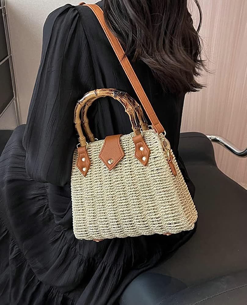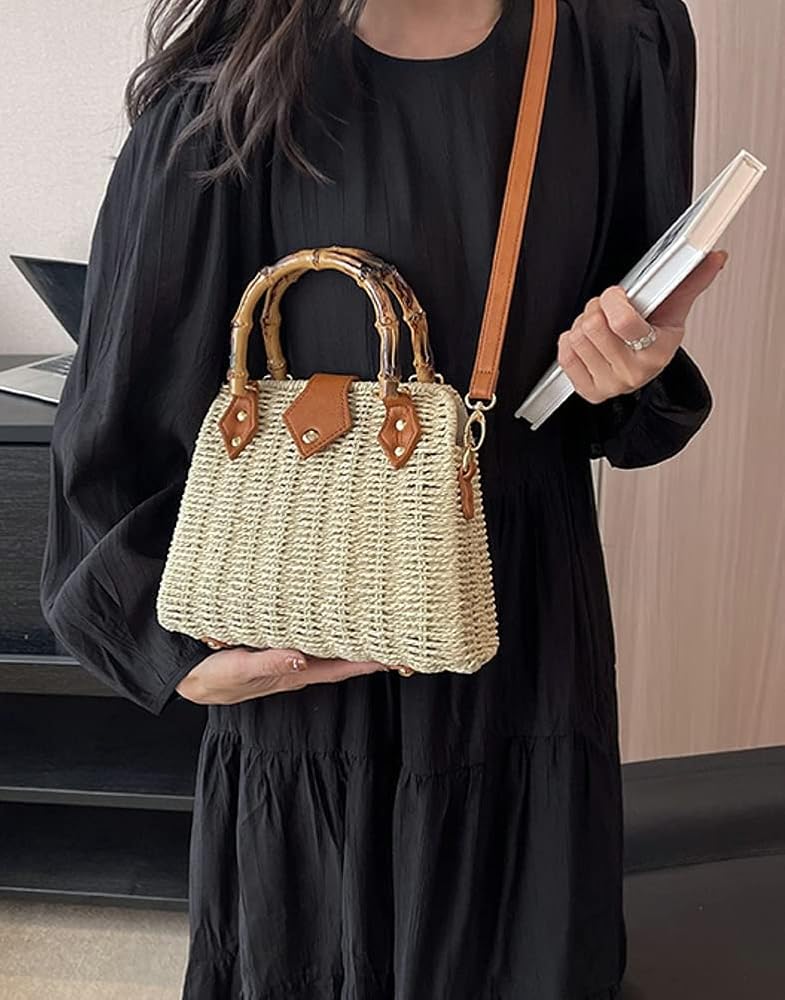 【Product Features】Hand-woven rattan with hand-woven knit elements and craftsmanship, fashion bamboo handle, a adjustable & detachable PU leather shoulder strap, strong magnetic snap closure, convenient carrying as a purse handbag, shoulder beach tote and crossbody bag. It is a natural, unique, and trendy bag for summer beach or your daily days.