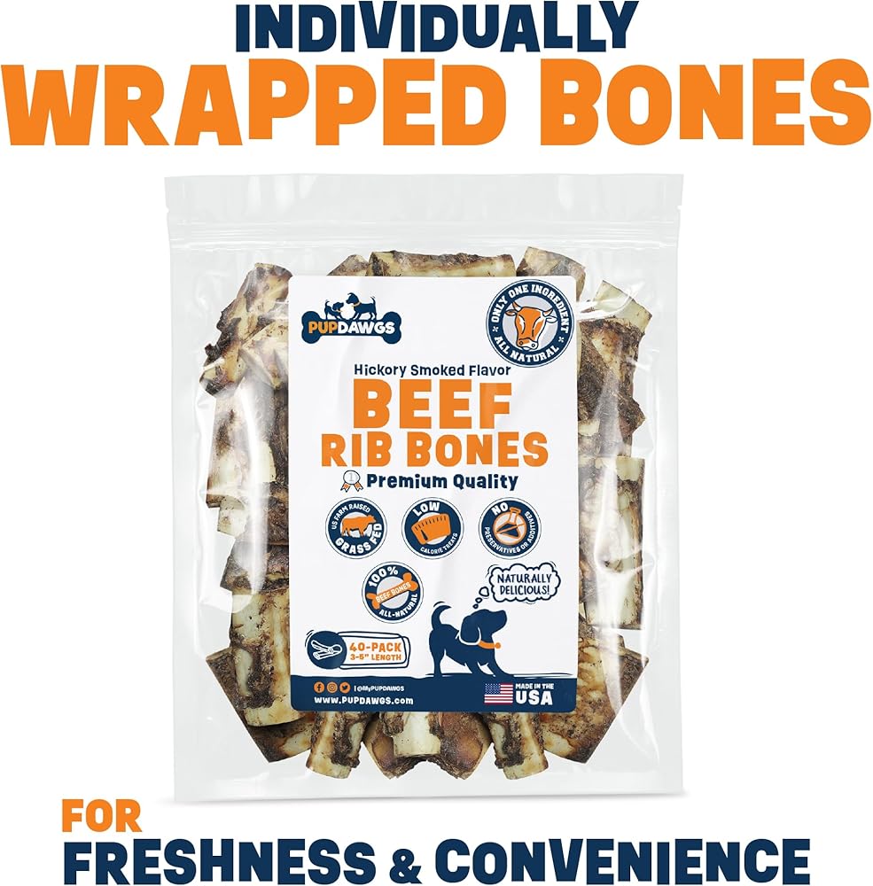 Single Ingredient Dog Bones - Made in USA - Small Beef Rib Bones - Natural Dog Bones for Aggressive Chewers - from USDA Inspected Beef - Hickory Smoked - Wrapped in Sets of 5 (40 Piece Pack)