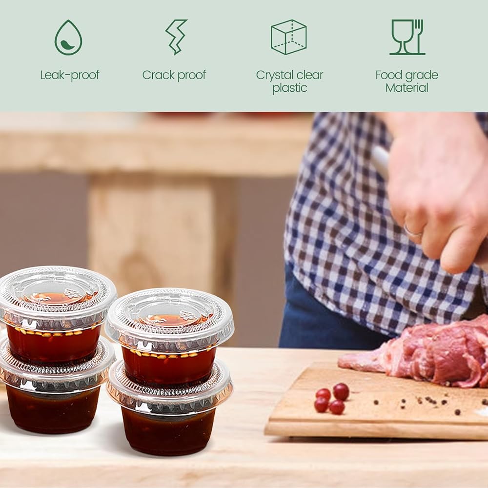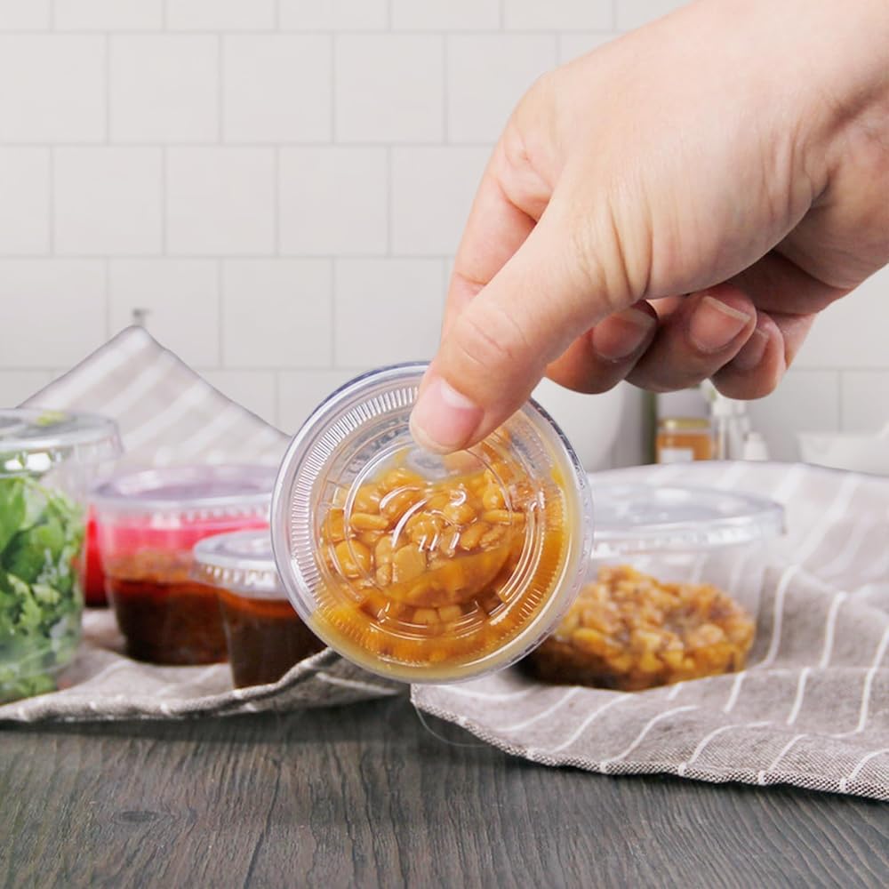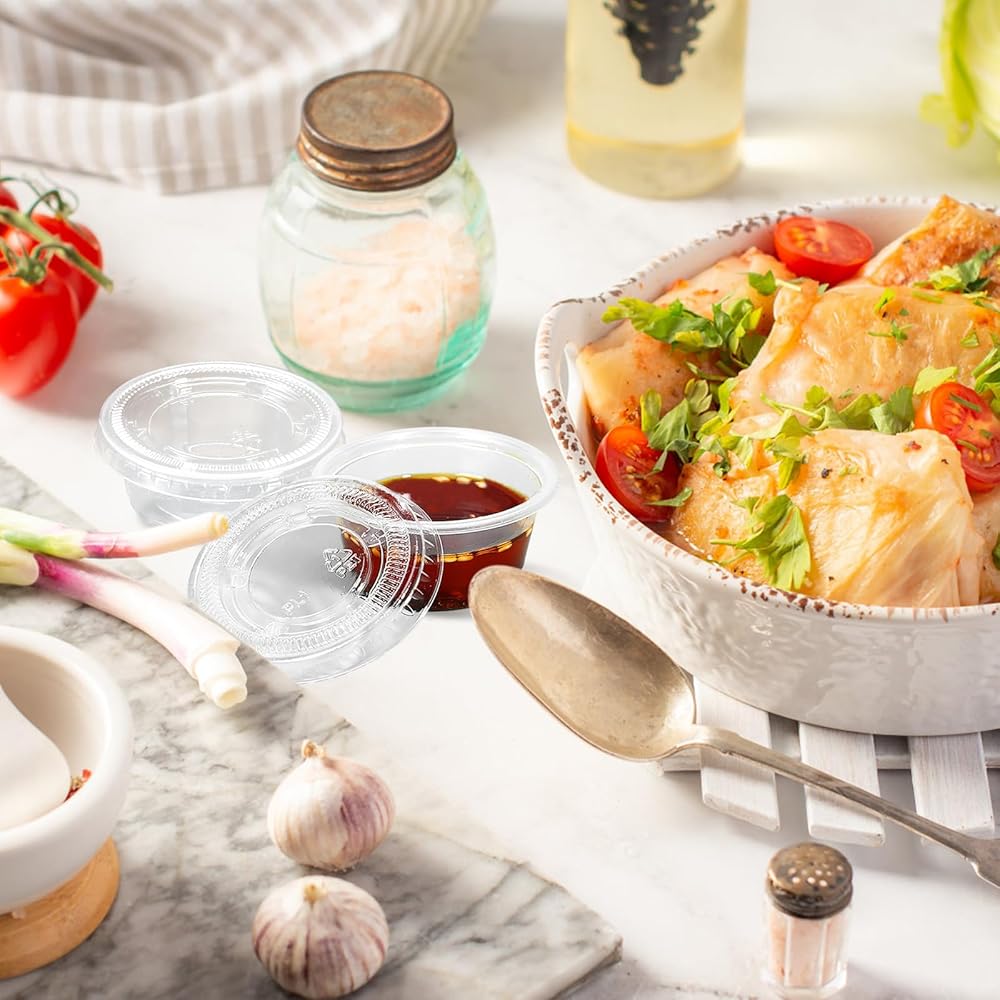 [أكواب بلاستيكية متعددة الأغراض] هذه الأكواب البلاستيكية هي الحاوية المثالية للغمس والفواكه المجففة والحلوى والتوابل والمزيد. استخدمها للطلبات الخارجية من محلات الوجبات الجاهزة، أو لتغليف مجموعة متنوعة من الصلصات مسبقًا لبوفيه أو مناسبة تقديم الطعام، أو لمتاجر البقالة لتجربة عبوات العينات الصغيرة.