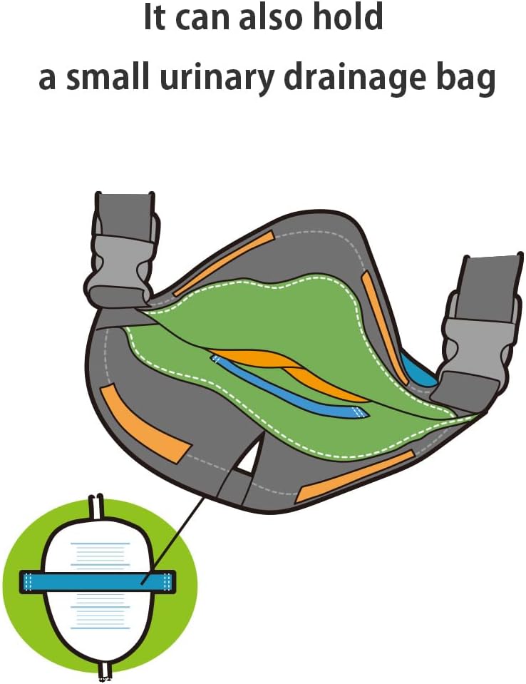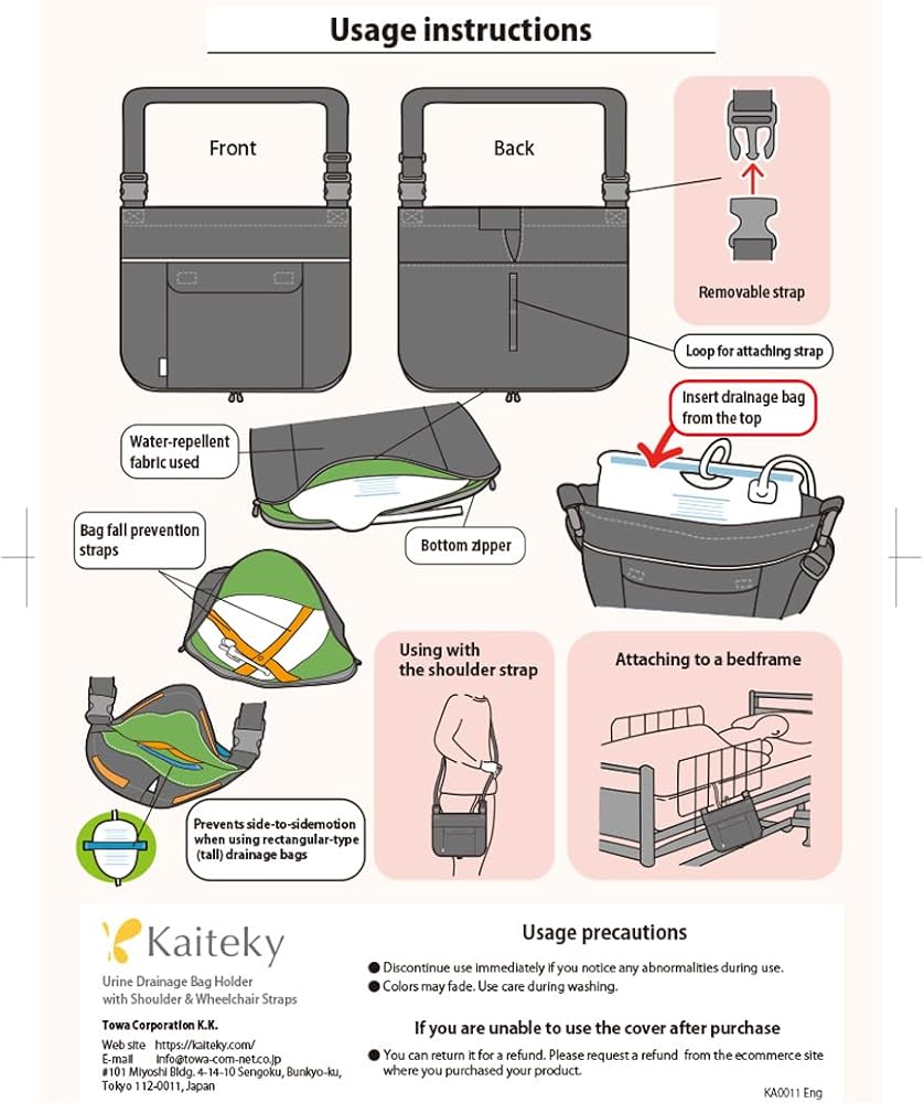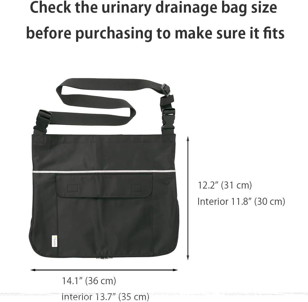 This product is a urine drainage bag holder that comes with shoulder straps, wheelchair attachment straps, and a hose cover. It features a zipper that can be opened from the bottom, a convenient pocket, and water-resistant fabric. Fits urinary drainage bags up to 13.3” (34 cm) × 11.0” (28 cm). Easy-to-follow user manual included.