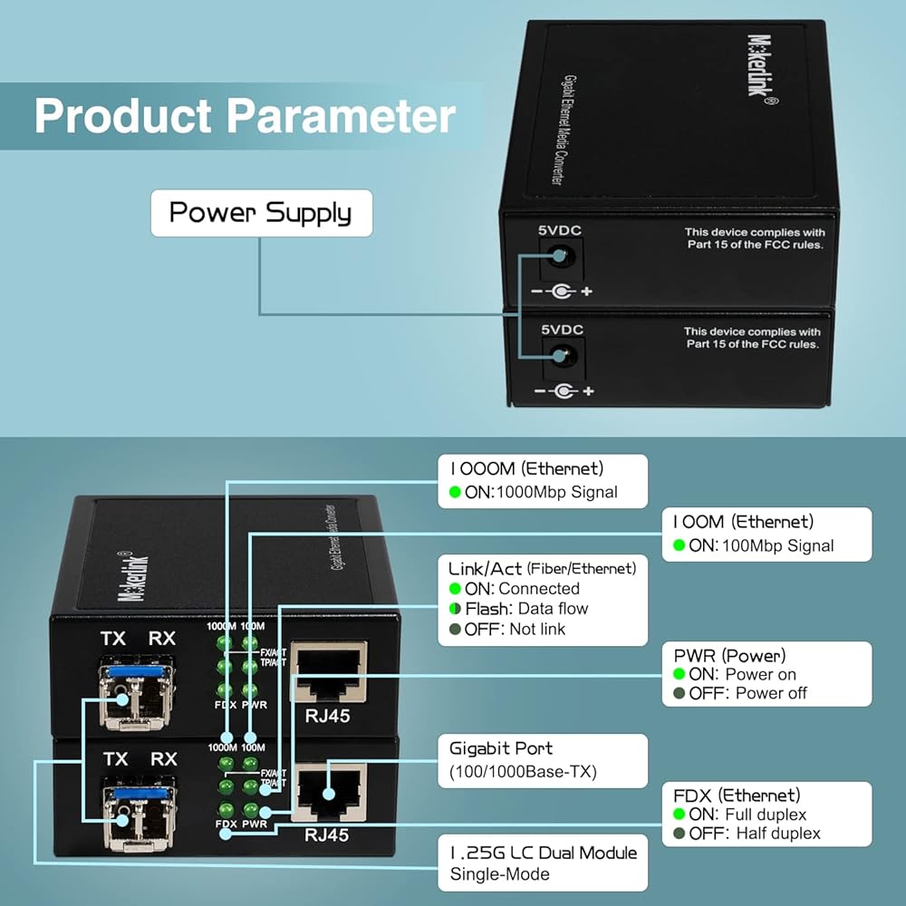 Plug and Play: connect the power supply, connect to the peer device through the optical fiber and the network cable, then can use it without configuration. **Please pay attention to the use of single-mode fiber with LC interface 1310nm, and TX/RX cross connection**