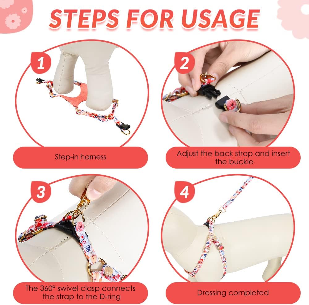 【Easy to Use】:Our Step-in harness is very easy to put on and take off with the fast-release safety buckle in just a few steps. Just put their front feet into the hole, snap the buckle and adjust it until it is suitable, then finished. This puppy harness is easy to control and ideal for walking, jogging, hiking, training, etc.
