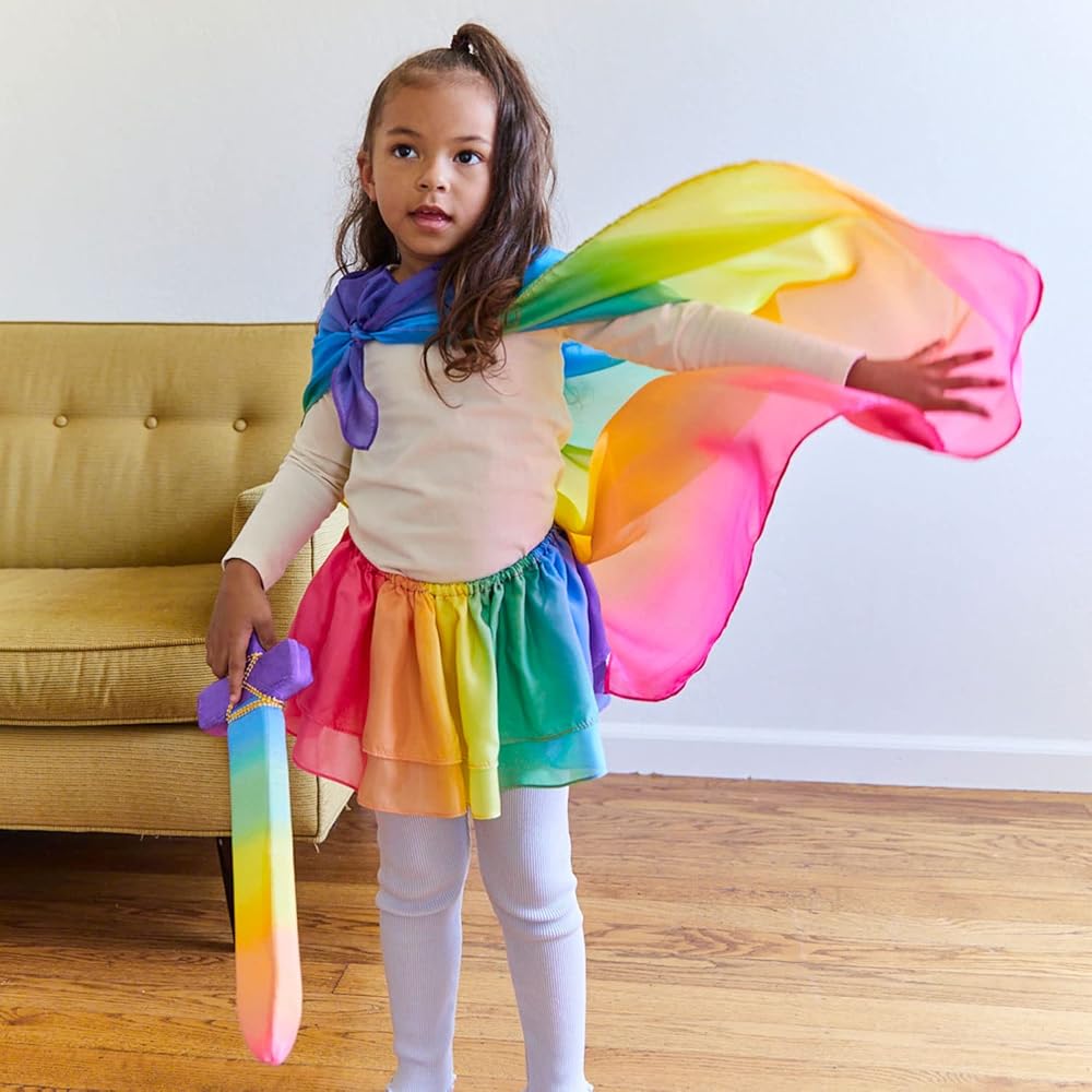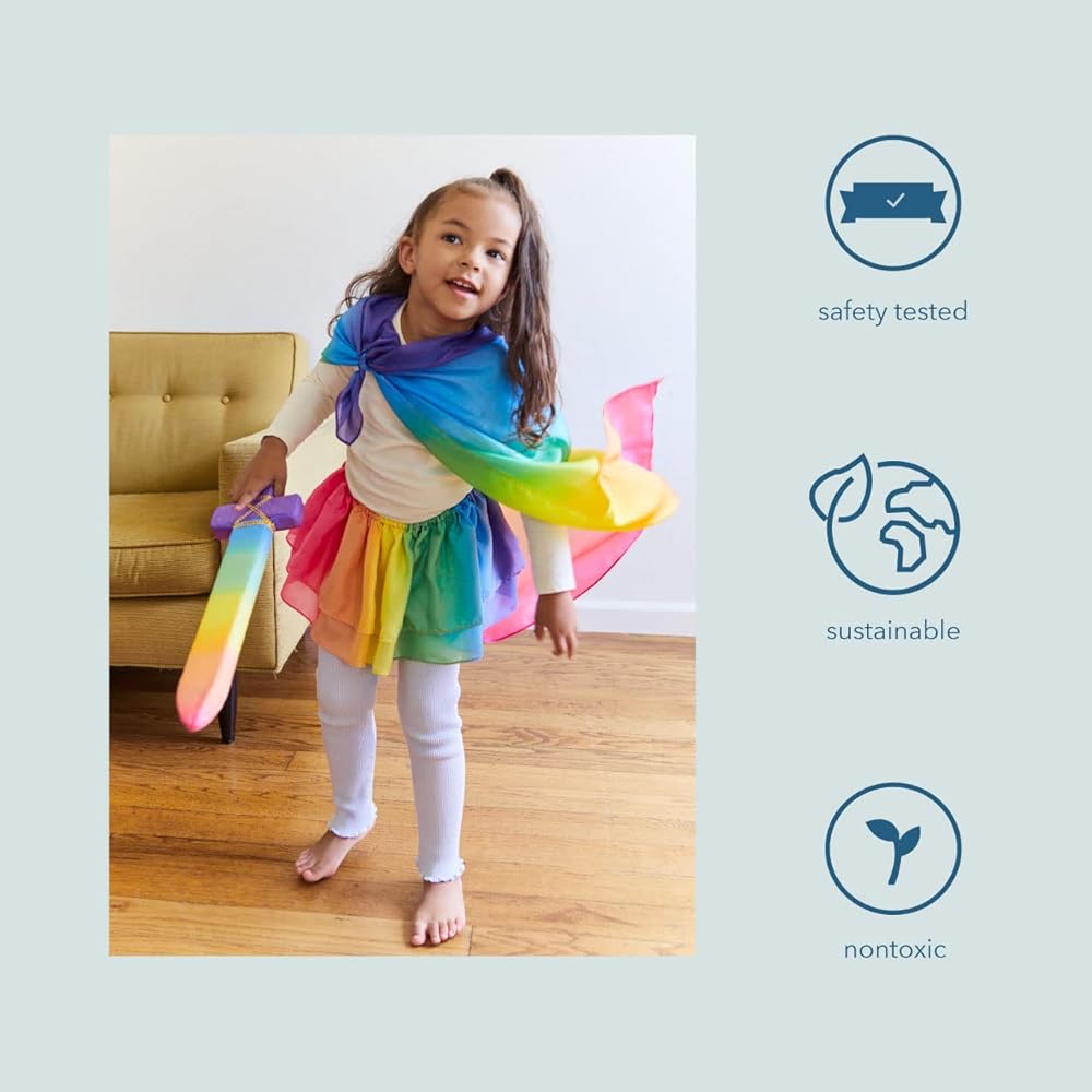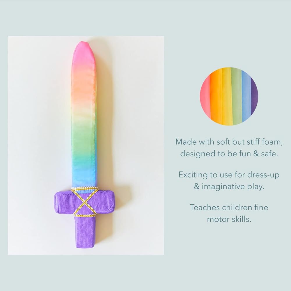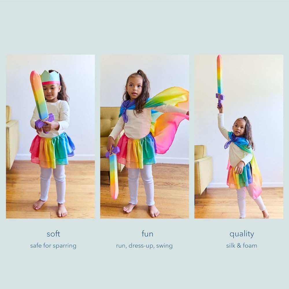 We use authentic silk sewn securely around soft but stiff foam. This combination makes for a beautiful sword that will never hurt when sparring, and will also last for endless hours of imaginative play
