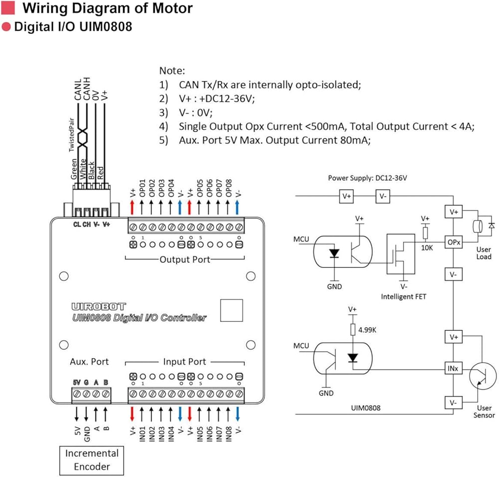 [I/O CONFIGURATION] The module includes 8 digital input ports and 1 quadrature encoder interface. It offers 1500V photoelectric isolation and ESD protection. Additionally, it provides 8 digital outputs, each capable of handling 500 mA per port, and featuring 1500V photoelectric isolation. V+ operates within a range of DC 12-36V. V- is at 0 V potential.