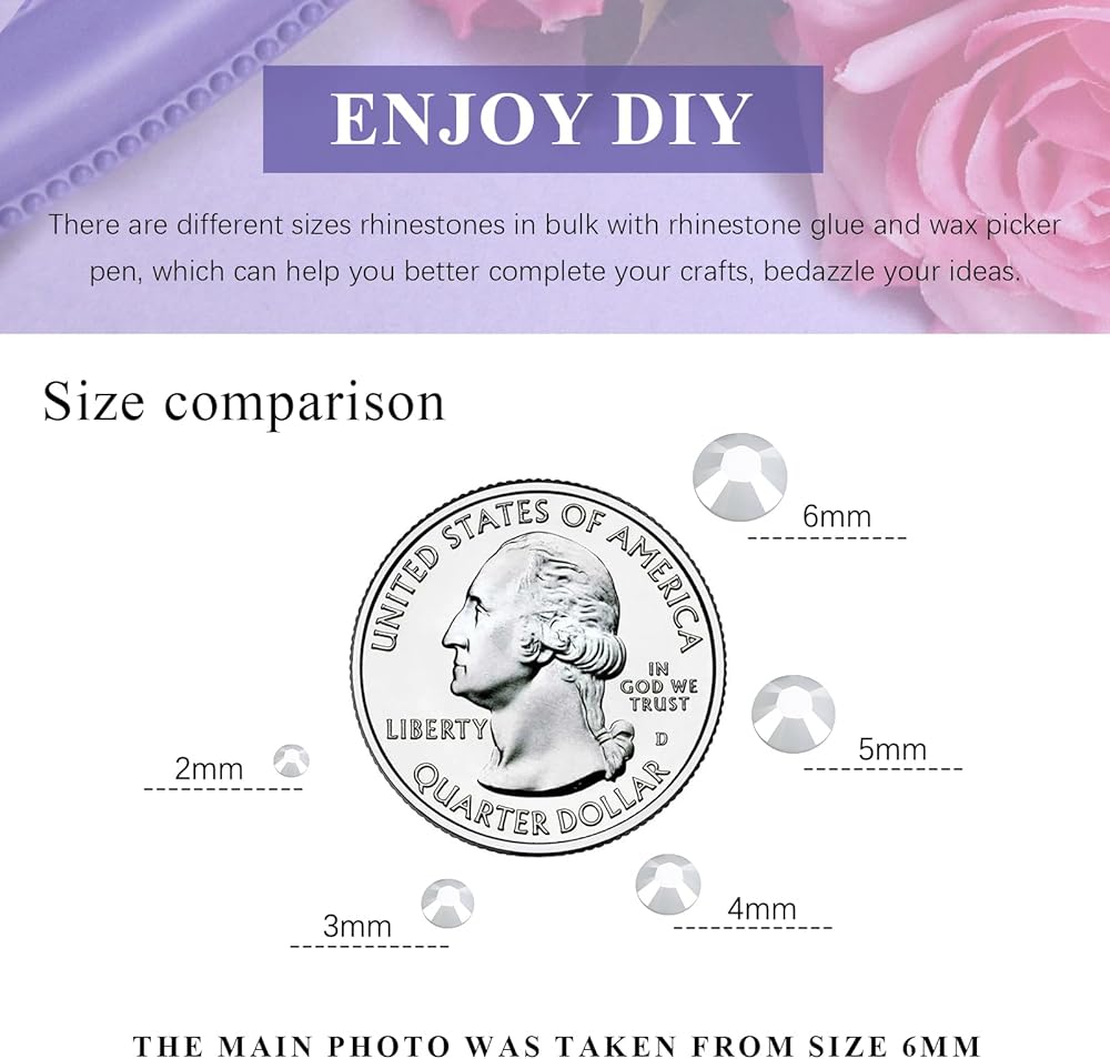 🎀 What You Will Receive: You will receive a bag of 1500pcs 6mm flatback rhinestones, with 2 tubes of B7000 clear rhinestone glue and 1 wax pickup pencil, which is a simple rhinestones bedazzler kit.
