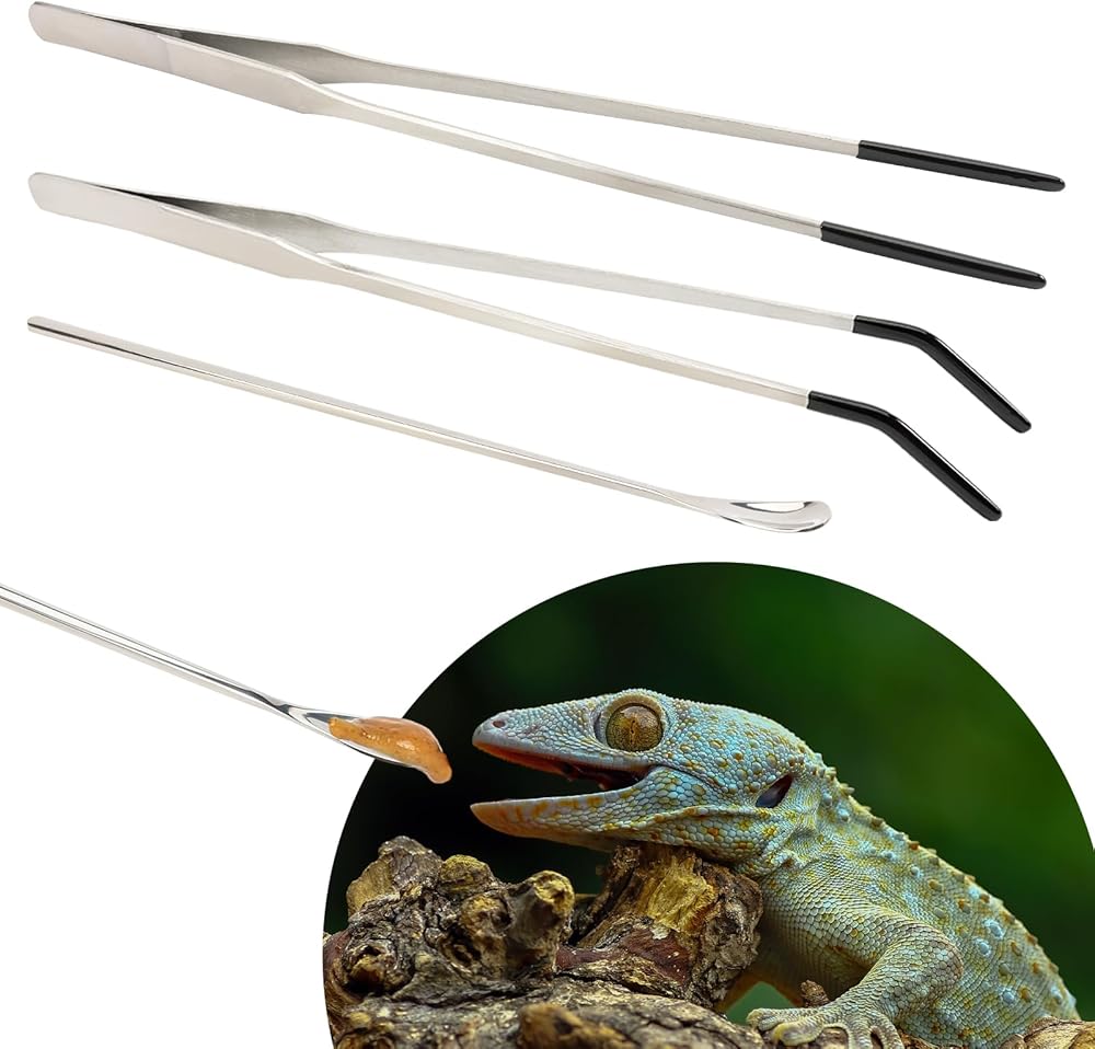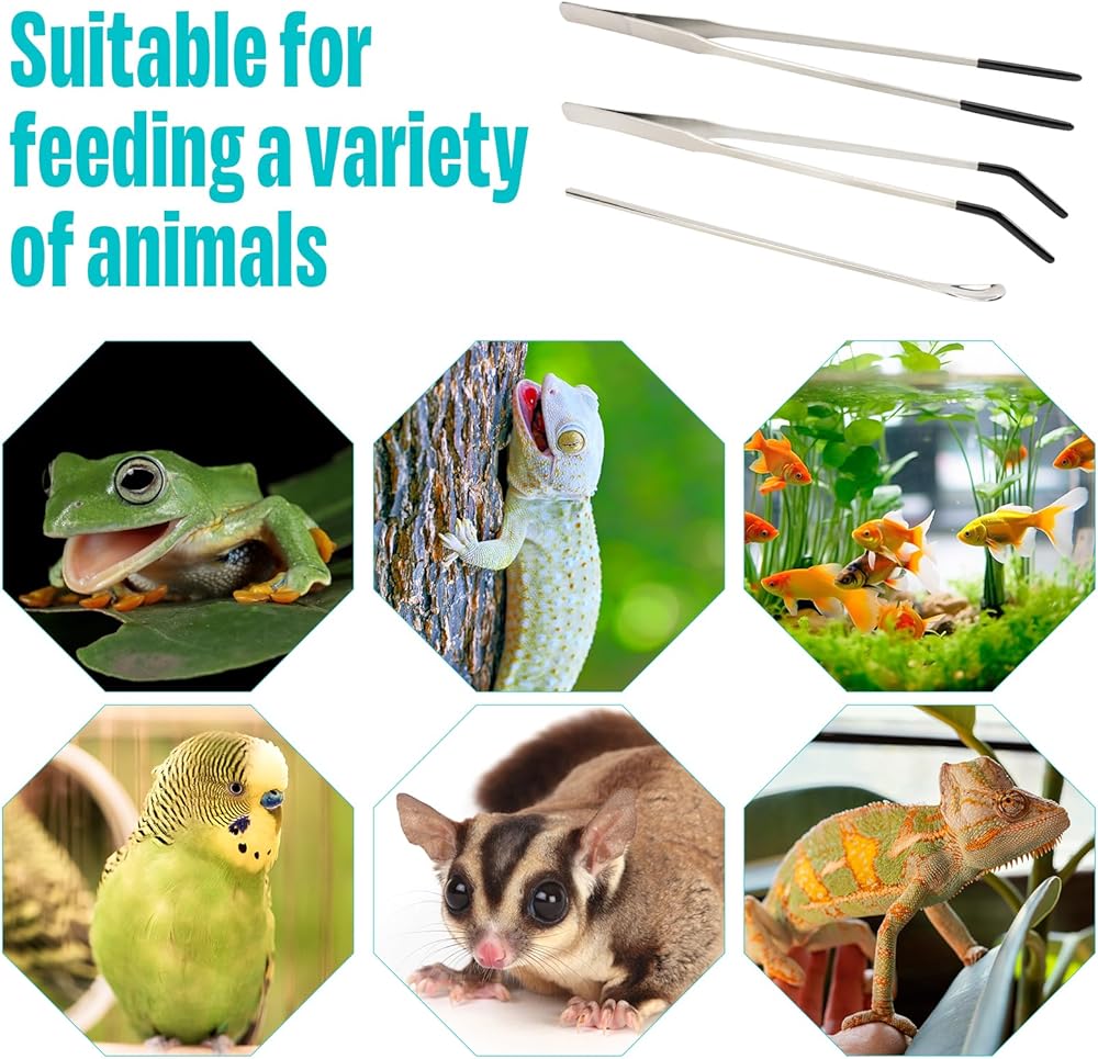 Versatile Set: Our package includes 2 stainless steel feeding tongs with distinct tip designs (straight and curved) for precise control, along with a specially designed reptile food spoon. This combination ensures you're equipped for various feeding tasks, from dishing out crested gecko food to bearded dragon snacks.