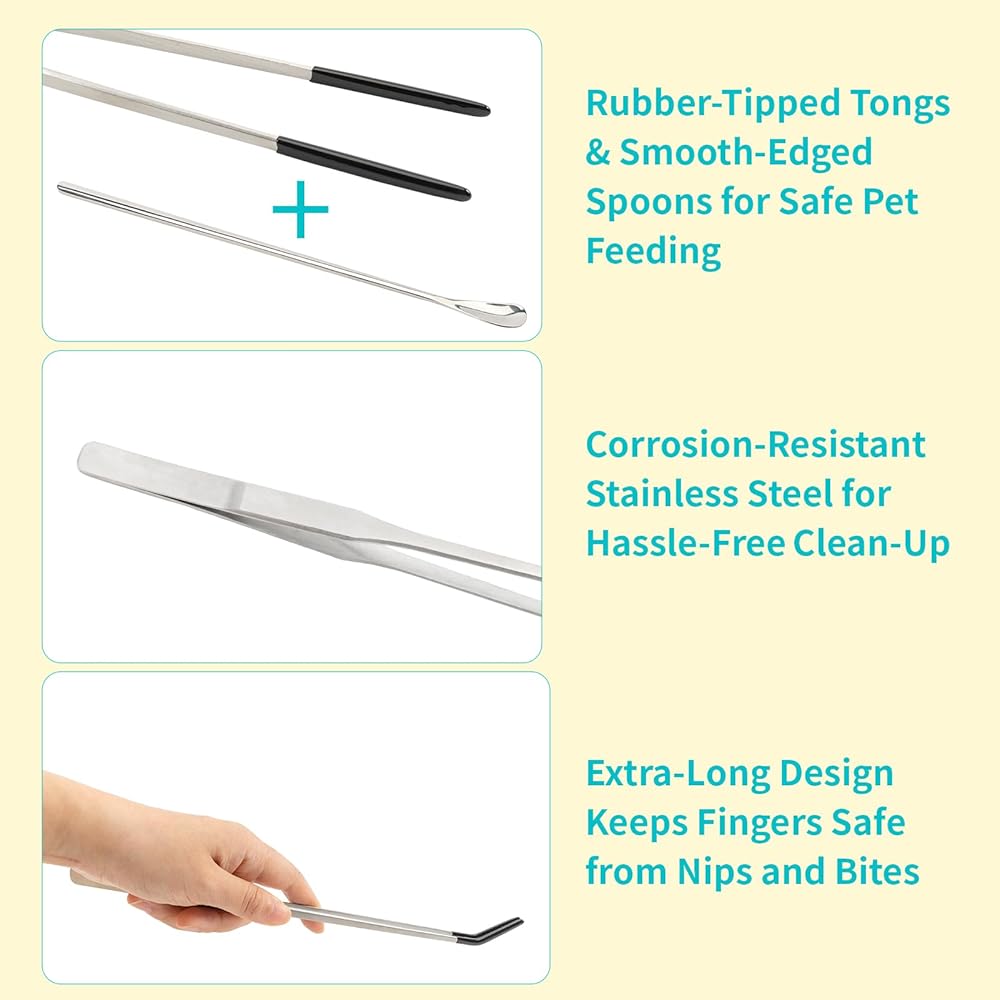 Multipurpose Use: Beyond serving as essential bearded dragon food utensils, this set is incredibly versatile. Use it to mix mash, snacks, and nutritional supplements quickly, fostering a closer bond between you and your pet. The tongs are also great for handling aquarium plants or picking up worms, offering a fantastic user experience for a variety of pets and purposes.