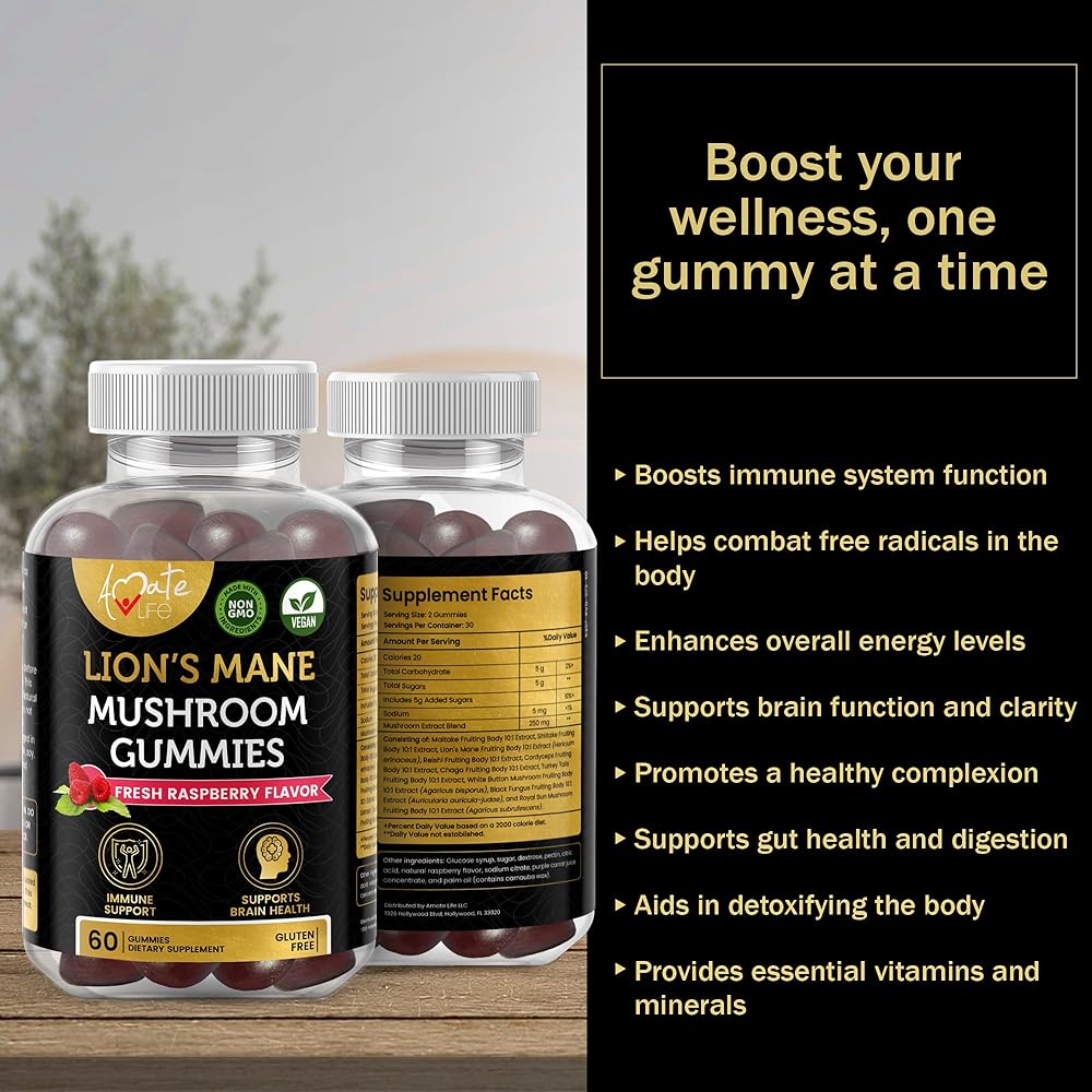 Aamatec Life Mushroom Gummies for Adults | 10 Mushroom Complex with Lions Mane Reishi Chaga & Cordyceps Mushroom | Brain, Immune & Energy Support | Raspberry Flavor