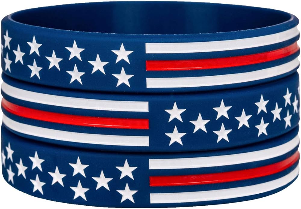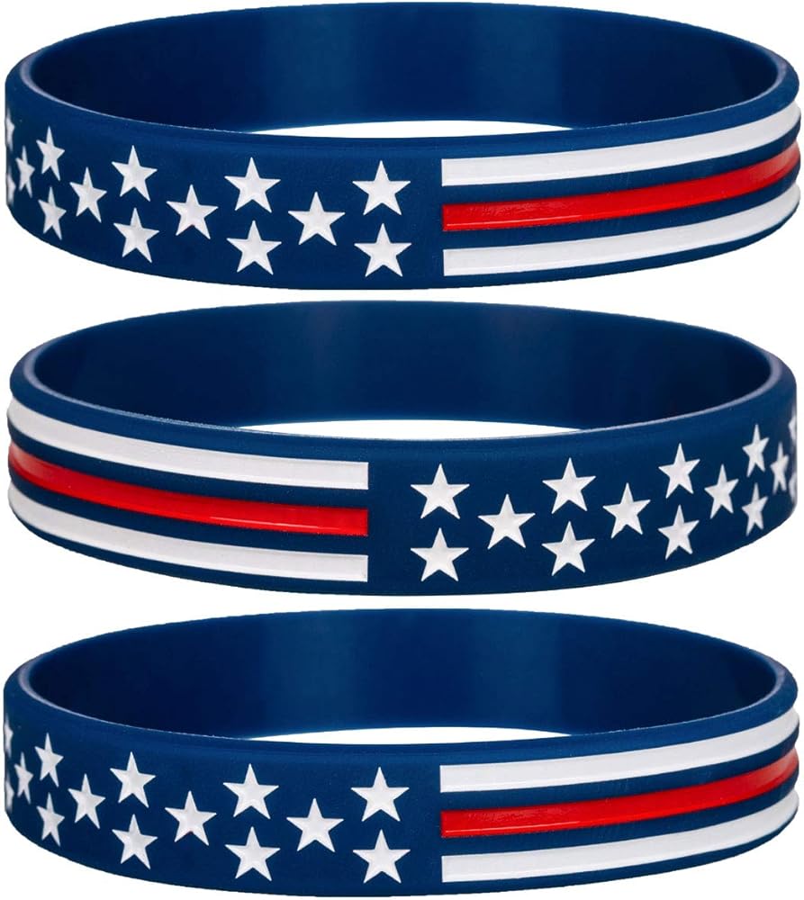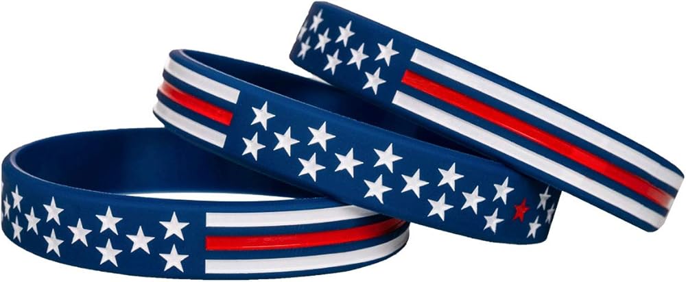 The American Pride & Fourth of July Independence Day Motivational Bracelets - This set of 3 silicone rubber wristbands includes an assortment of unique designs: Thin Red Line , Red Star and U.S.A. Flag. Show Your Support It. Thin Red Line wristbands keep your support at the forefront with wristbands that are eye-catching conversation-starters.