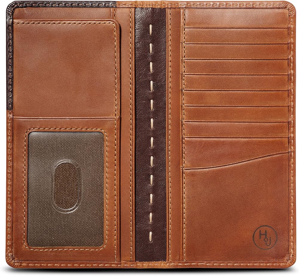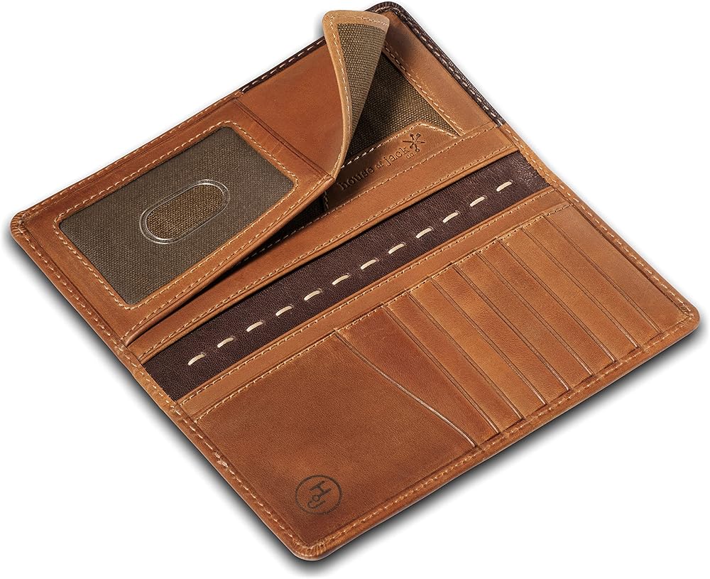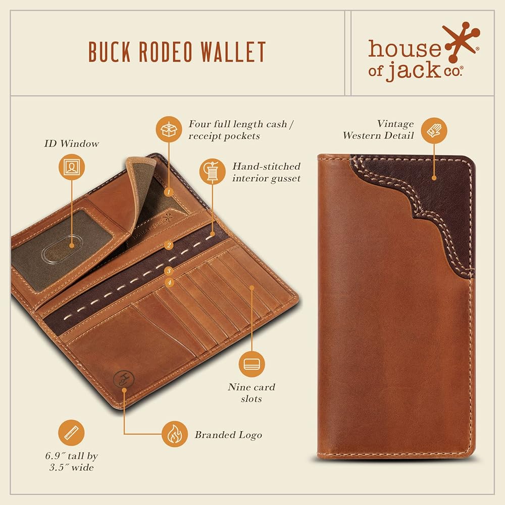 Introducing House of Jack Co.'s Rodeo Wallet, the ultimate men's long wallet that embodies rugged sophistication and unparalleled craftsmanship. This long bifold men's wallet is the epitome of masculine leather and functional design, created for the regular guy who demands both style and practicality. Crafted from premium full grain cowhide, this men's leather wallet is built to last, offering a luxurious and durable companion for your everyday adventures. The Rodeo Wallet combines the elegance of a men's tall wallet with the convenience of a checkbook wallet, providing ample space to organize your essentials. With a generous number of card slots, spacious bill compartments, and a dedicated id window, this wallet is designed for those who value both form and function. Its slim, streamlined silhouette ensures that you carry everything you need without unnecessary bulk. At the heart of Jack's Rodeo Wallet is the philosophy "Wallets That Let You Be You." This is not just a wallet; it's an extension of your personal style, a statement of who you are. Whether you're dressing up for a night out or heading to the ranch, this wallet complements your lifestyle with effortless ease. Our motto, "Your Style – Our Expertise," ensures that each wallet is meticulously crafted to reflect your individual style while maintaining the highest standards of quality. This western wallet's thoughtful design and premium cowhide set it apart from the rest, offering you the best of the best. No one does wallets better than our friend, Jack, whose attention to detail and dedication to quality shines through in every stitch. From the smooth, supple leather to the durable construction, this men's wallet is made to withstand the test of time. Experience the blend of function-first designs and timeless design with Jack's Rodeo Wallet. Whether you're a seasoned cowboy or a city guy who loves the western scene this wallet is your go-to for carrying everyday essentials. Long story short, Jack's Rodeo Wallet Collection is the best choice for those who appreciate quality, durability, and a touch of rugged elegance. Upgrade your everyday carry with this exceptional leather wallet and embrace the epitome of the cowboy lifestyle.