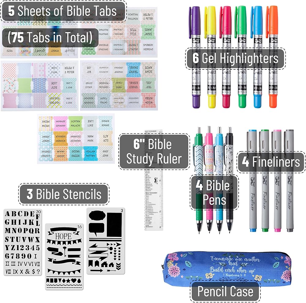 The package includes 6 gel highlighters, 4 bible pens, 4 fine liners, 1 set of bible tabs, 1 ruler, pack of 3 stencils, and a pencil case