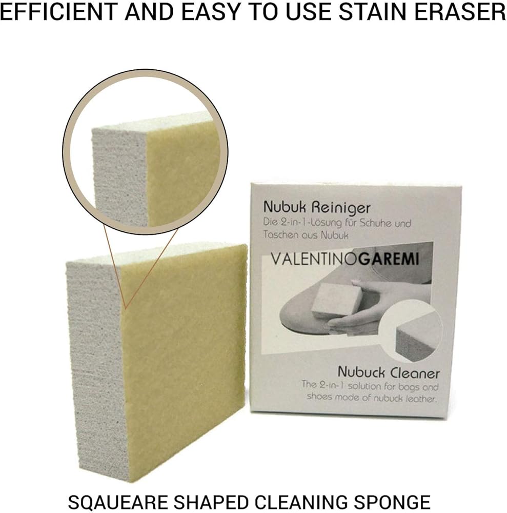 ⚜️CREATED WITH MANY CRUCIAL FEATURES- Manufactured in Germany for Valentino Garemi, the cleaning sponge has two separate sides intended for different applications. The rough side has the ability to clean deeper into the chosen garment to remove thicker, larger stains while the soft side is specially made for surface spots, light mud and dust. We recommend to use this Valentino Garemi Nubuck cleaner along with a soft bristles brush to refresh the leather napped garment after using the cleaner.