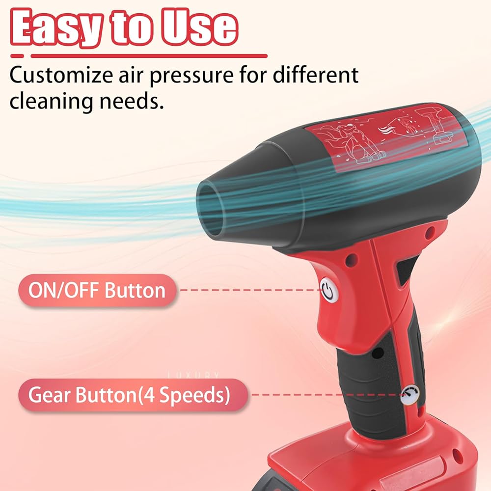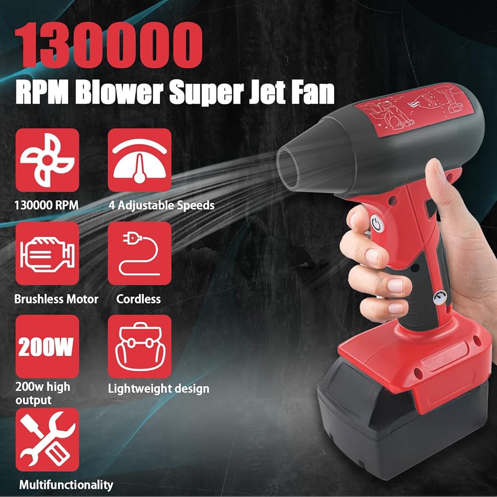 👍【Easy to Operate and Safe to Use】: The blower is controlled by only 2 buttons, 1 button controls the on/off switch. The side button changes 4 speeds: 8M/s, 17M/s, 25M/s, 30M/s. Jet Fan up to 130,000RPM/Min. Built-in low voltage protection to protect your battery, please feel free to use it. Warm tip: Remove it from the battery when you are not using it.