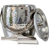 SPECIFICATIONS: Material: Heavy-duty 0.7mm stainless steel. Color: Silver – Hammering. Shape: Round. Size: 7.7" diam x 7"H. Capacity: 3qt / 3/4 gallon. Holds 1 bottle of wine or champagne with ice.
