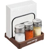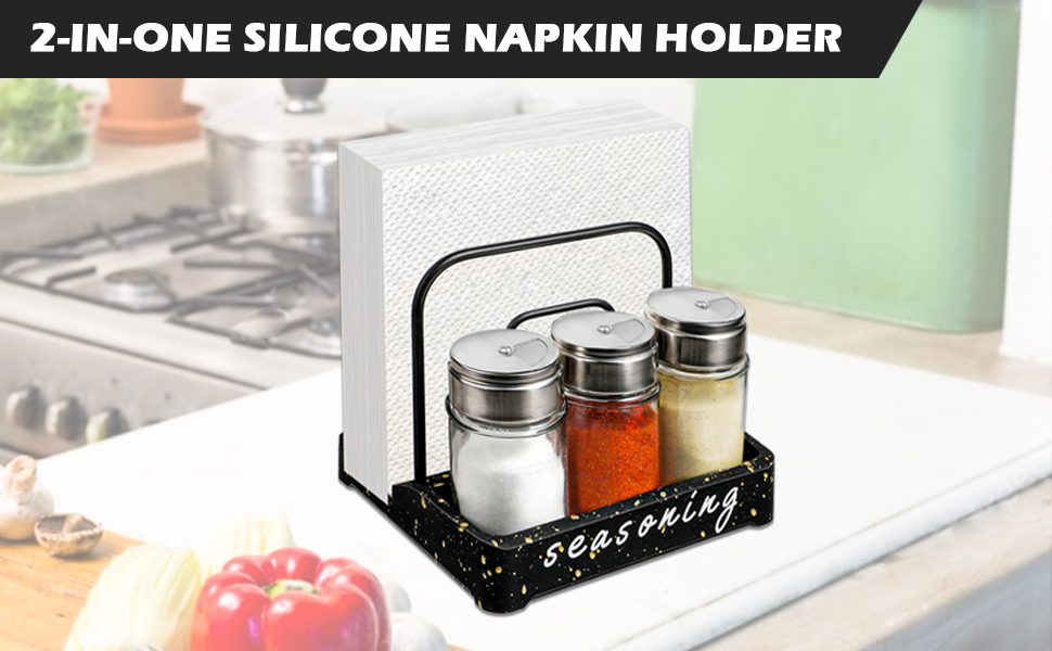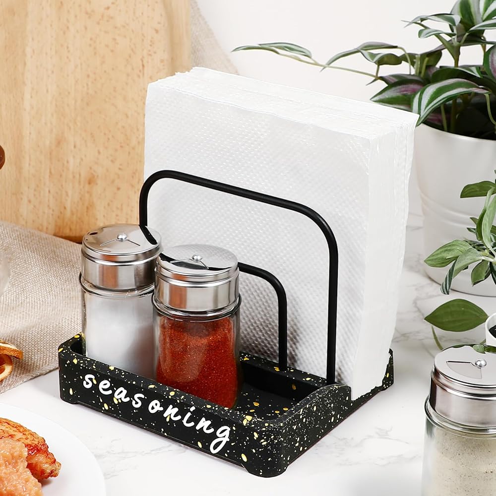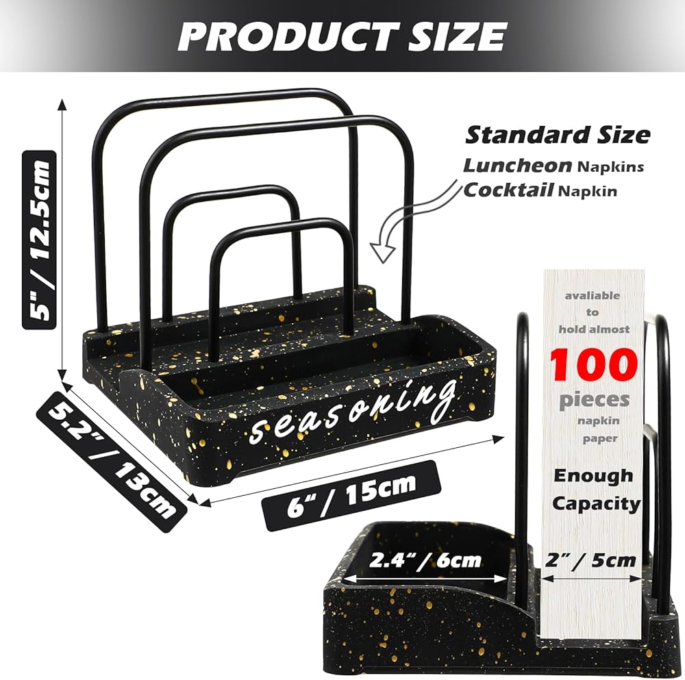 🖤2-IN-1 NAPKIN HOLDER Two separate sections with large enough size and storage space, this rack can be used as desktop organizer to save space. Not only can hold kitchen napkin,but also suitable for 3 seasoning bottles (napkins or salt and pepper shakers not included). Keep the kitchen napkins separate and organize salt and pepper shakers, spices, honey, sugar and other accessories at the same time. Holds 100pcs both standard size paper napkins or cocktail napkins.