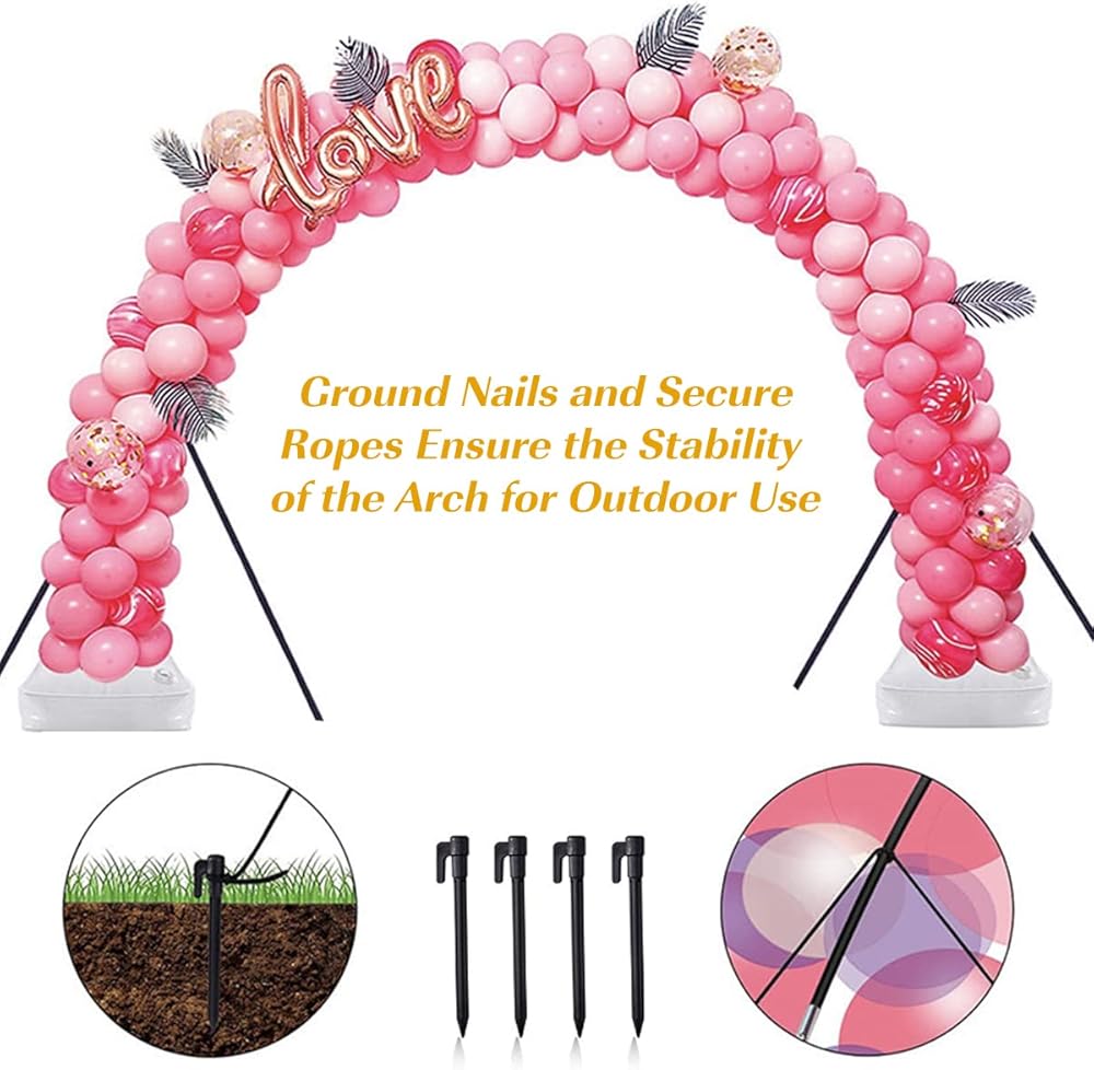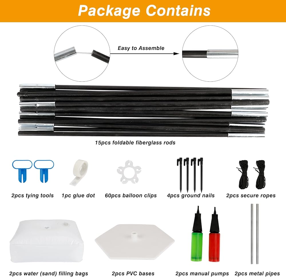 Complete Set: The balloon arch kit includes 15 16-inch foldable fibreglass rods, 2 PVC bases, 2 metal pipes, 2 water or sand bags, 60 balloon clips, 2 manual pumps, 2 knotters, 1 dot glue, 4 ground nails, 2 secure ropes and 1 instruction guide. These components are enough for two people to DIY a beautiful balloon arch together.