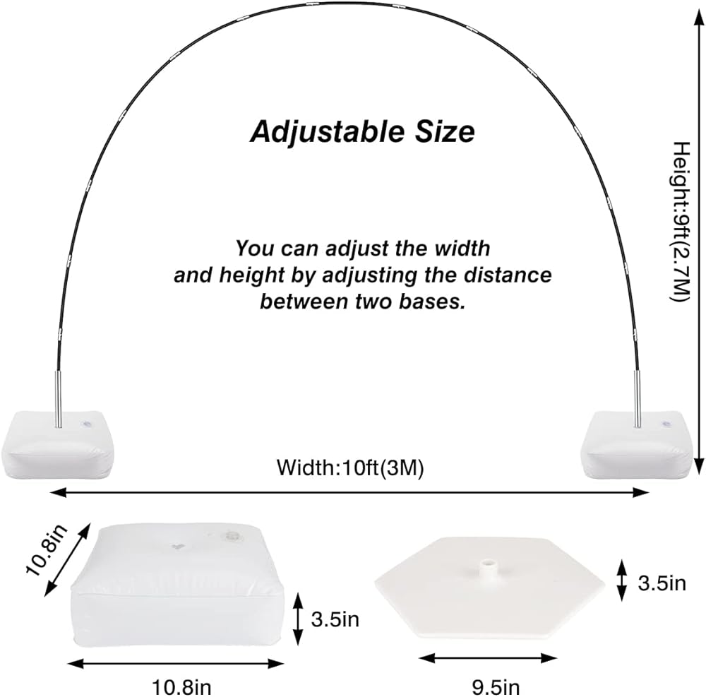 Adjustable Width: The ballon arch holder kit is usually 10ft wide and 10ft tall, but you could adjust the height and width of the bow by adjusting the distance between the bases according to you needs.