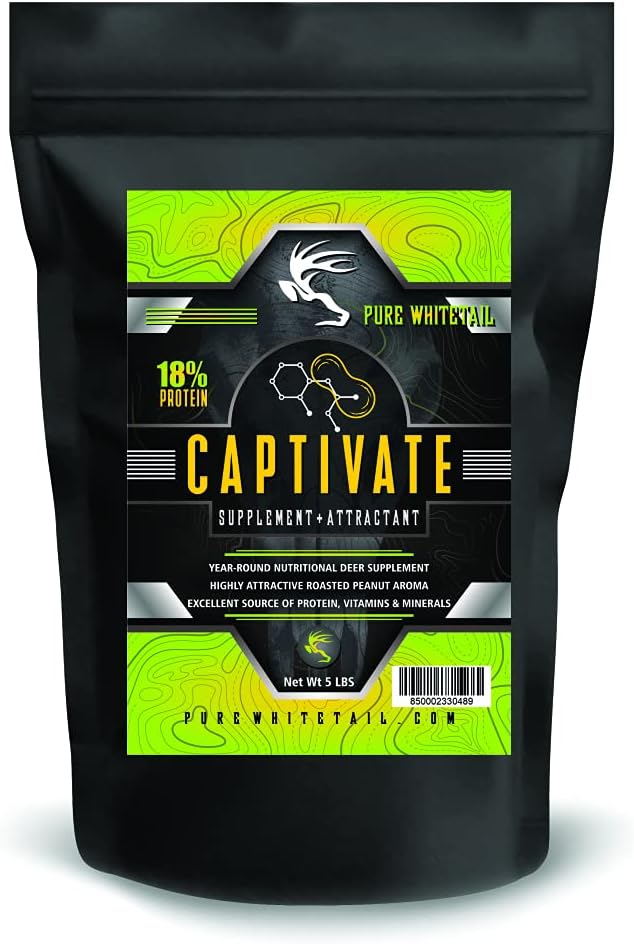 Pure Whitetail's Captivate supplemental feed delivers an amazingly strong aroma of roasted peanuts that whitetail deer and other wildlife love. With a base of roasted peanuts that provides a great sources of protein and fat, Captivate is a protein packed supplemental feed that also contains key vitamins and minerals that are critical for increased antler growth and overall body development. Captivate is the perfect mixture of proteins, vitamins and minerals that whitetail deer crave. It can be used year round as a supplemental food source with an delicious smell that deer will continue to enjoy. Use in front of trail cameras to inventory your herd and continue using throughout the season as a reliable food source. GUARANTEED ANALYSIS: CRUDE PROTEIN . . . Min 18% CRUDE FAT . . . Min 12% CRUDE FIBER . . . Max 9% SALT . . . Min 1% Max 2% CALCIUM . . . Min 1% MAGNESIUM . . . Min 0.40% SULFUR . . . Min 0.21% IRON . . . Min 250 ppm COPPER . . . Min 10 ppm Max 25 ppm ZINC . . . Min 70 ppm MANGANESE . . . Min 80 ppm SELENIUM . . . Min 0.30 ppm VITAMIN E . . . Min 5,000 IU/L