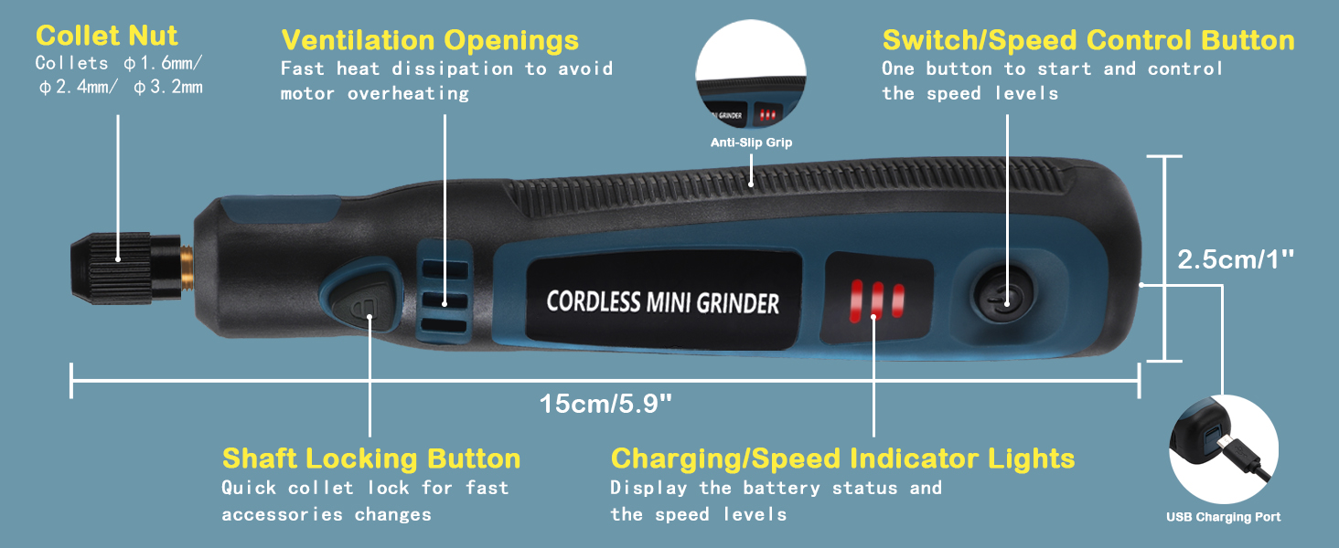 【USB Rechargeable Engraver】This cordless rotary tool is equipped with a 650mAh lithium battery and can work continuously for 120 minutes after a full charge, allowing you to delve into your craft without interruptions of sudden battery depletion. Moreover, the engraving pen has a built-in overload protection chip. When the resistance is too high, it will automatically cut off the power for self-protection to avoid damaging the motor to prolong the service life.