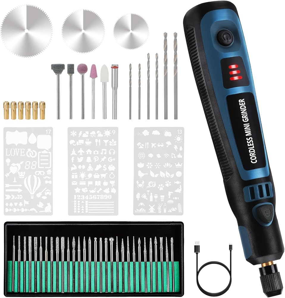 【Universal Engraving Tool Kit】Unlock boundless creativity with our comprehensive engraving tool kit. This set includes a mini engraving pen with 72pcs tool accessories, including 30 interchangeable diamond burr bits, 6 drill bits, 5 grinding bits, 19 stencils for inspiration, 3 cutting discs, 1 wheel mandrel, 6 collets for adaptability, a charging cable, and a user manual. From delicate detailing to bold designs, this versatile set offers you a wide array of options for every creative project.