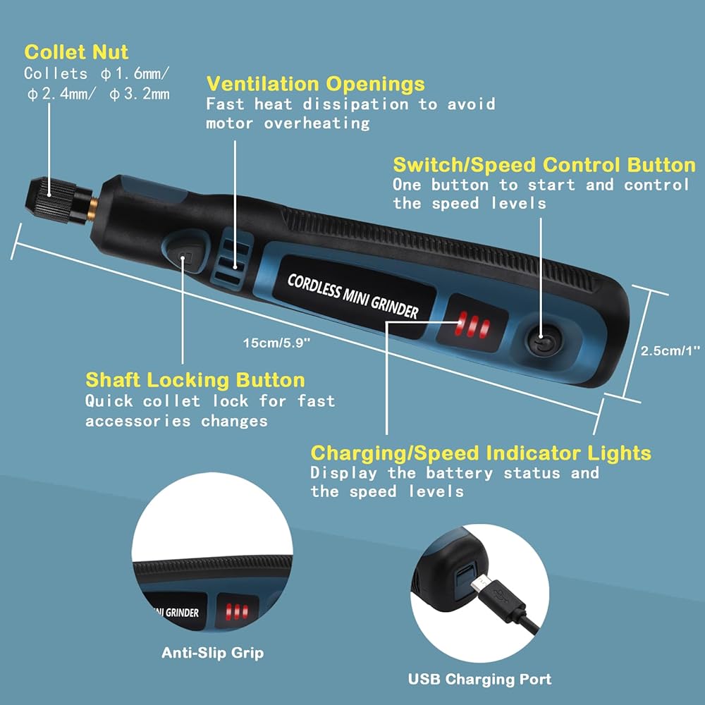 【Easy to Control】Craft with confidence using our user-friendly electric engraver.Just press the switch button, then you can start/turn off the engraving machine and adjust the speed levels. There is also a shaft locking button for easy and quick accessory changes without any tools. The ergonomic design ensures a comfortable and anti-slip grip, allowing for extended use without hand fatigue. Suitable for both beginners and suitable for both beginners and experienced craftsmen.
