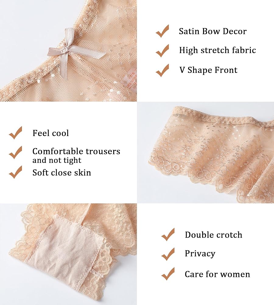 【Comfortable Lace Underwear for Women 】High Stretch Lace fabric will surely fit your comfortably,expertly accentuate your feminine curves to subtle perfection.V-shape design with hollow out elastic belt comfortable and not tight,which is full of beauty and mystery.Breathable and moisture-wicking fabric underwear keeps you dry and cool every day.