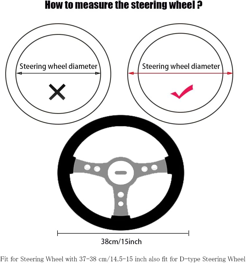 Universal Size:This elastic steering wheel cover stretches to fit standard steering wheels 36-38 cm/14.2-15 inch diameter. It's suitable for most standard steering wheels.Please measure the diameter of your car steering wheel for perfectly fit.