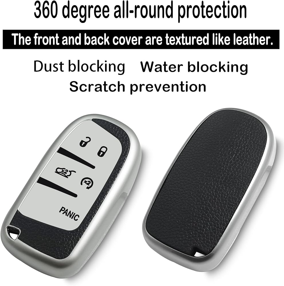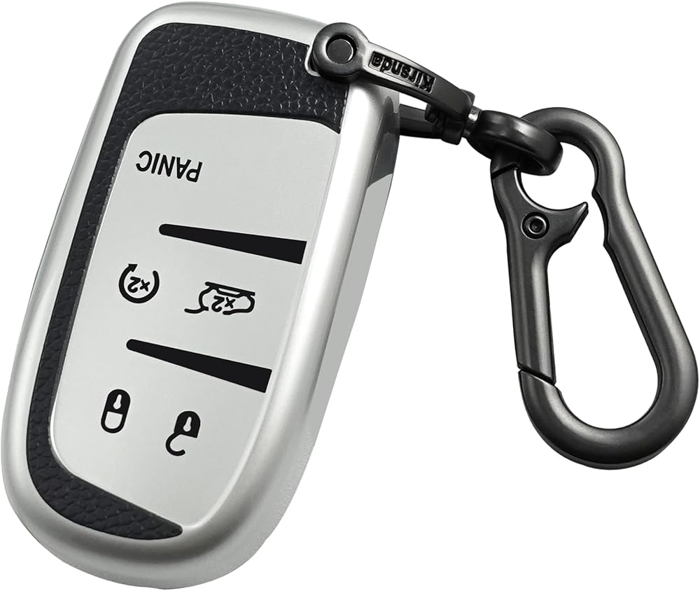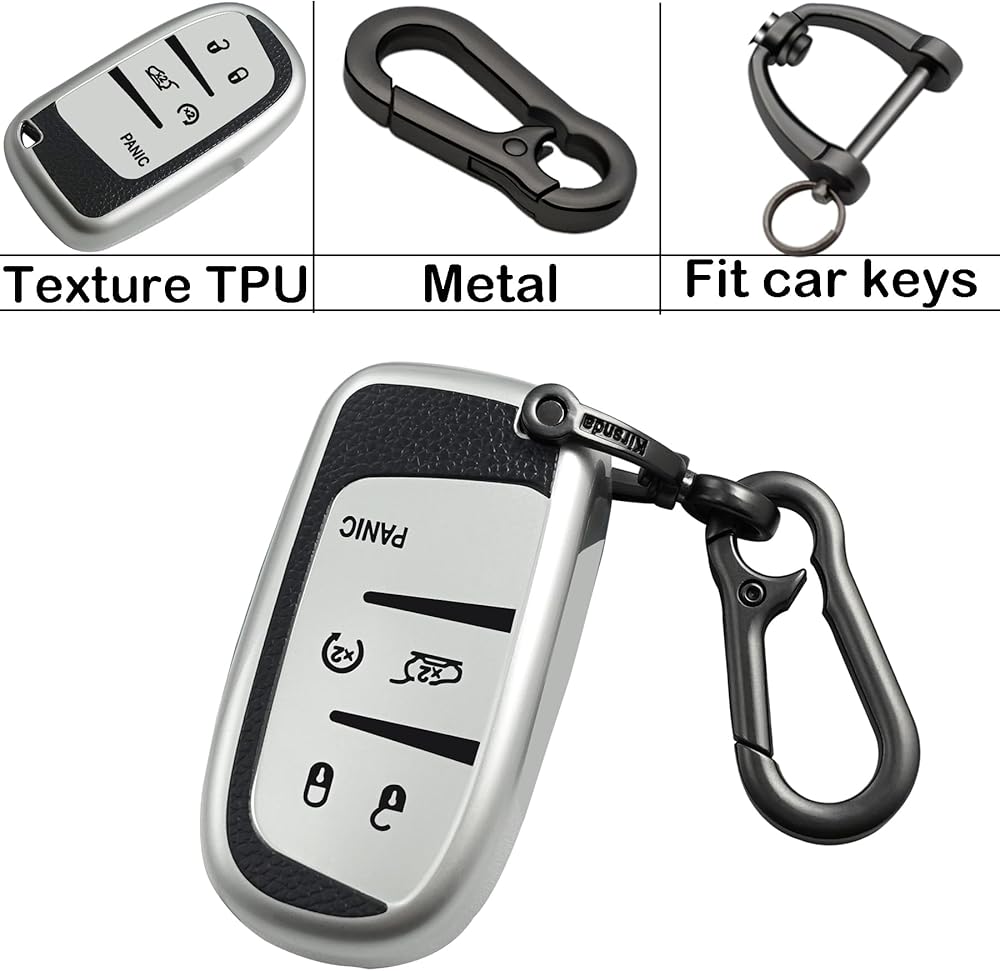 for Jeep key fob cover,Texture case,with Metal buckle,key Shell/skin,5-Buttons,fit Grand Cherokee Renegade for Chrysler for Durango Journey,ect Remote Key Vehicle Accessories,Silver