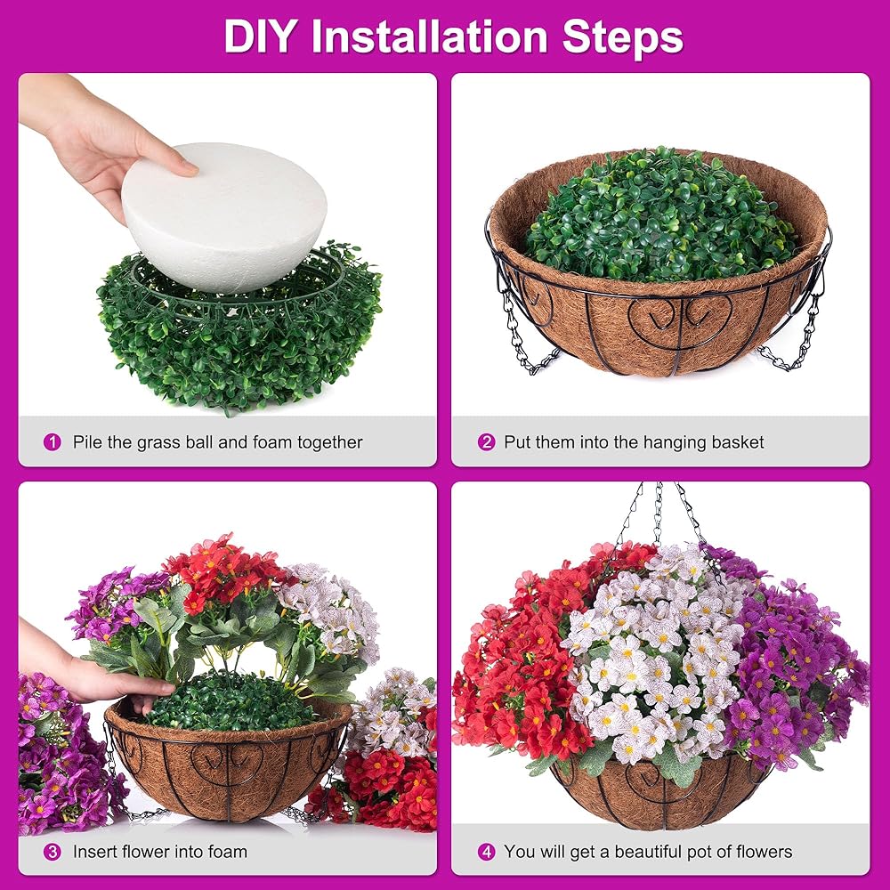 Packing specification: 4 PCS Petunias ,Each hanging branch is adorned with many forks of flowers and green leaves. 1 semicircle green grass liner and 1 semicircle basket. SELF-ASSEMBLE:Easy to do with a ,insert flower stems to the grass liner and get a beautiful hanging basket with flowers in 5 mins,lightweight but steady.