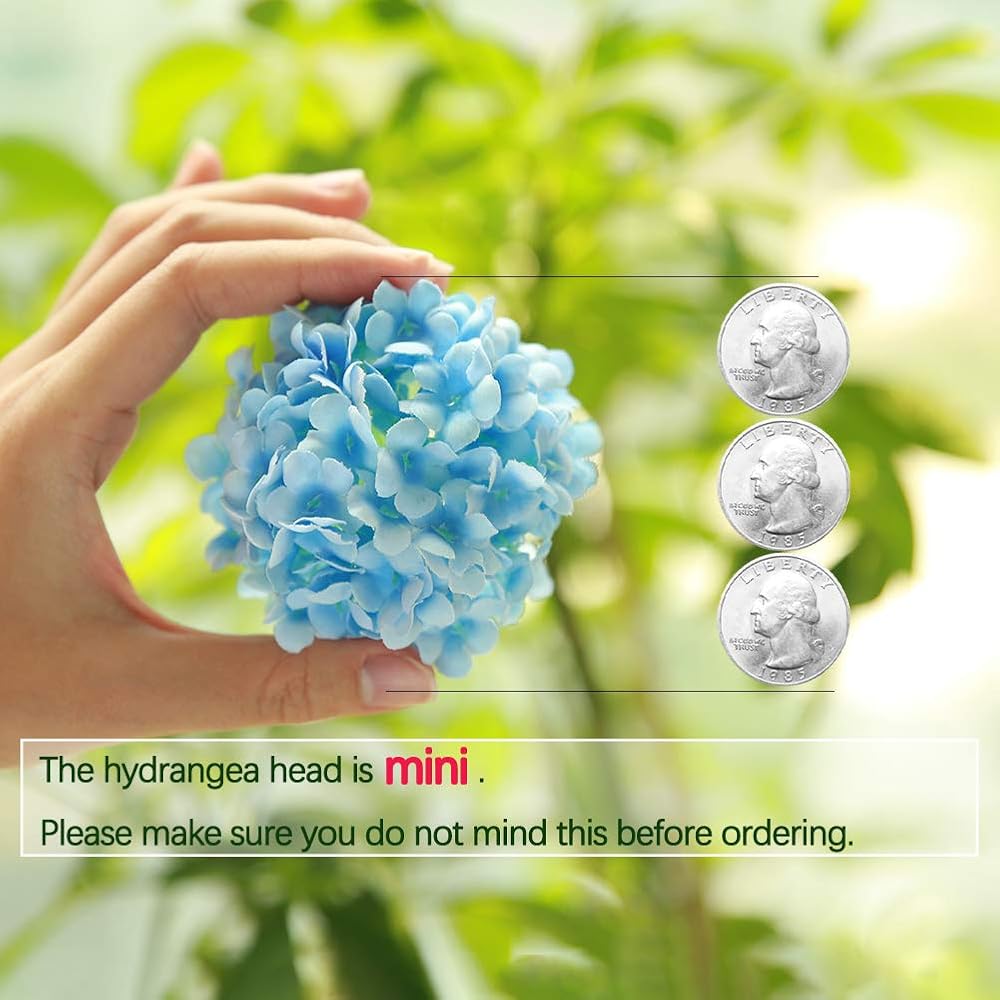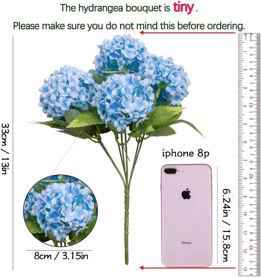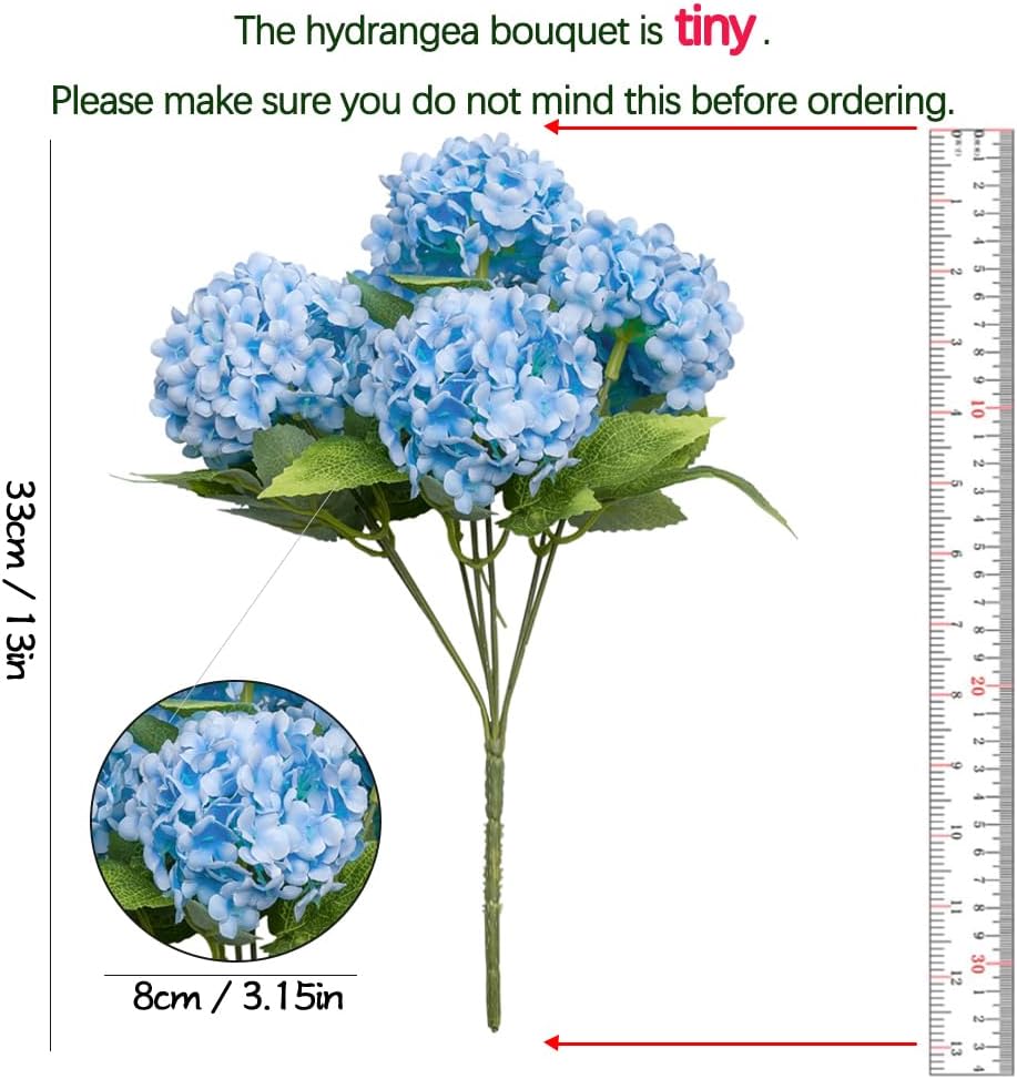 SIZE: Each hydrangea artificial bouquet is approximately 13 inches / 33 cm long.The picture shows the matching display of two bunches of hydrangea. If you want a full bouquet effect, it is recommended to buy two bunches.