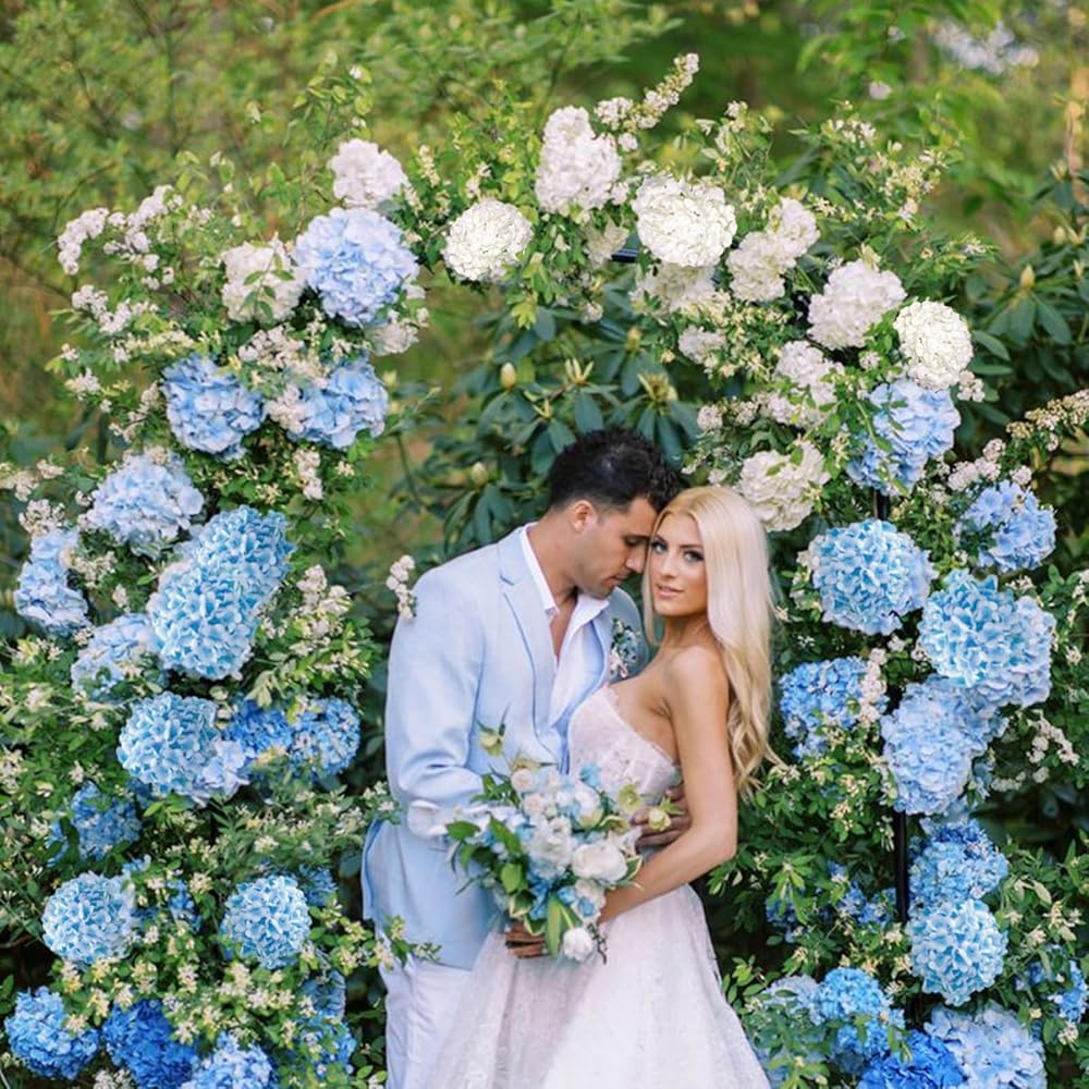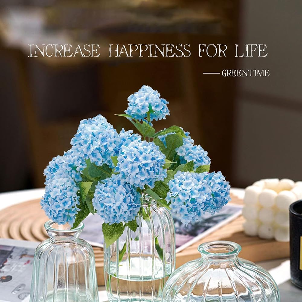 QUANTITY: Each package contains 1 hydrangea bouquet . There are 7 branches with 7 flower heads on the bouquet. The flower branches are not the same height, making the bouquet more layered. Each hydrangea branch has 2 leaves, and the green leaves are symmetrically distributed on both sides. Note: The vase is NOT included!
