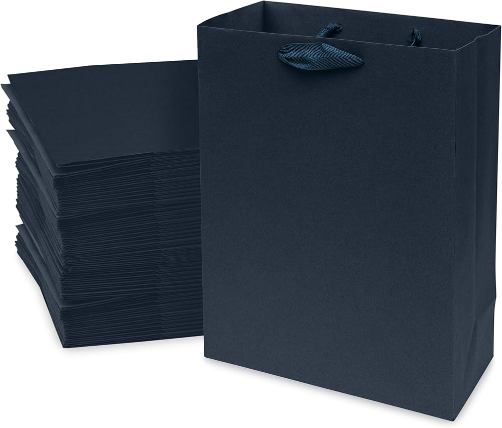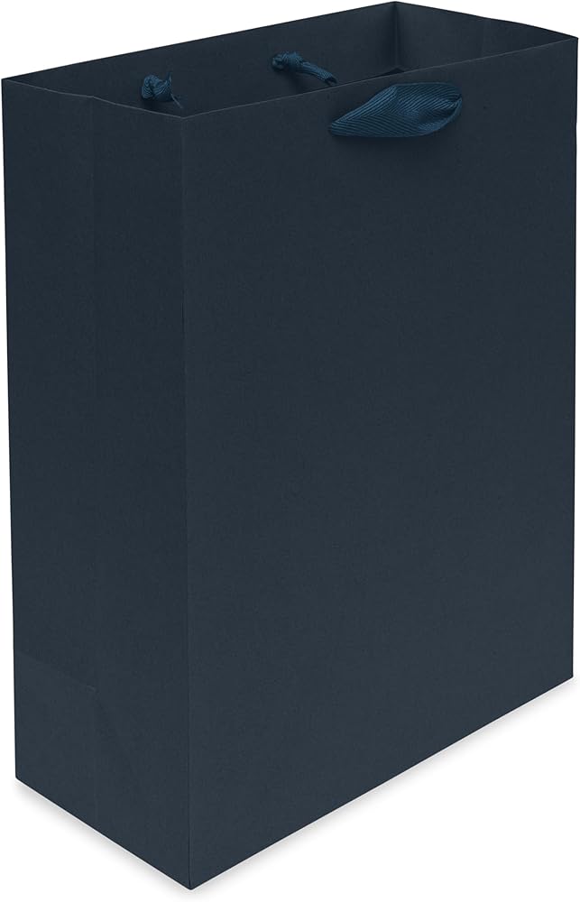 Made by Prime Line Packaging, our high quality and expertly crafted navy blue paper kraft twill handled shopping bags make for the perfect, more luxurious alternative to standard twisted paper handled kraft bags. Each designer inspired tote is made from recyclable 120 GSM navy blue kraft paper with a 350 GSM cardstock reinforced bottom to ensure a safe and secure carry. With 1” wide matching blue cotton twill handles, every bag has an elegant look perfect for boutiques and gift wrapping. Coming in packs of 50, each order is ready to handle any and all of your needs. These medium sized bags measure 10" wide by 5" deep by 13" tall, making them the perfect option to serve as merchandise bags for your customers and patrons, party favor holders, event bags, creative gift wrap for your friends and family, or bags for everyday packaging and storage use. The twill handles, reinforced with 350 GSM cardstock, help to ensure the bag won't break or tear while maintaining the utmost comfort and style. Each bag can hold several pounds and is constructed with a squared bottom for easy self-standup while loading and unloading. Their durable, timeless design makes them perfect for all your shopping, gift giving, or merchandising needs. For the creative spirit or the small business owner, these bags can be customized in a variety of ways, serving as a blank canvas to embellish with your business' logo, enabling you to tailor them to your own liking with stickers, markers, paints, stamps and more. Kraft paper bags serve as the perfect gift bags or shopping bags alike, and are a popular choice amongst retailers and restaurants, event planners and individuals. Each navy blue kraft bag is versatile enough to accommodate any need or event, from gift giving or party favors to customer purchases and take-out orders. Regardless of your needs, the design of these unique twill handle bags gives them a touch of sophistication while remaining strong when you need them to be.