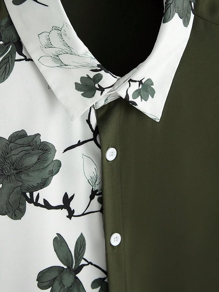 - Shirt: Colorblock, tropical print, floral print, button down, short sleeve, casual