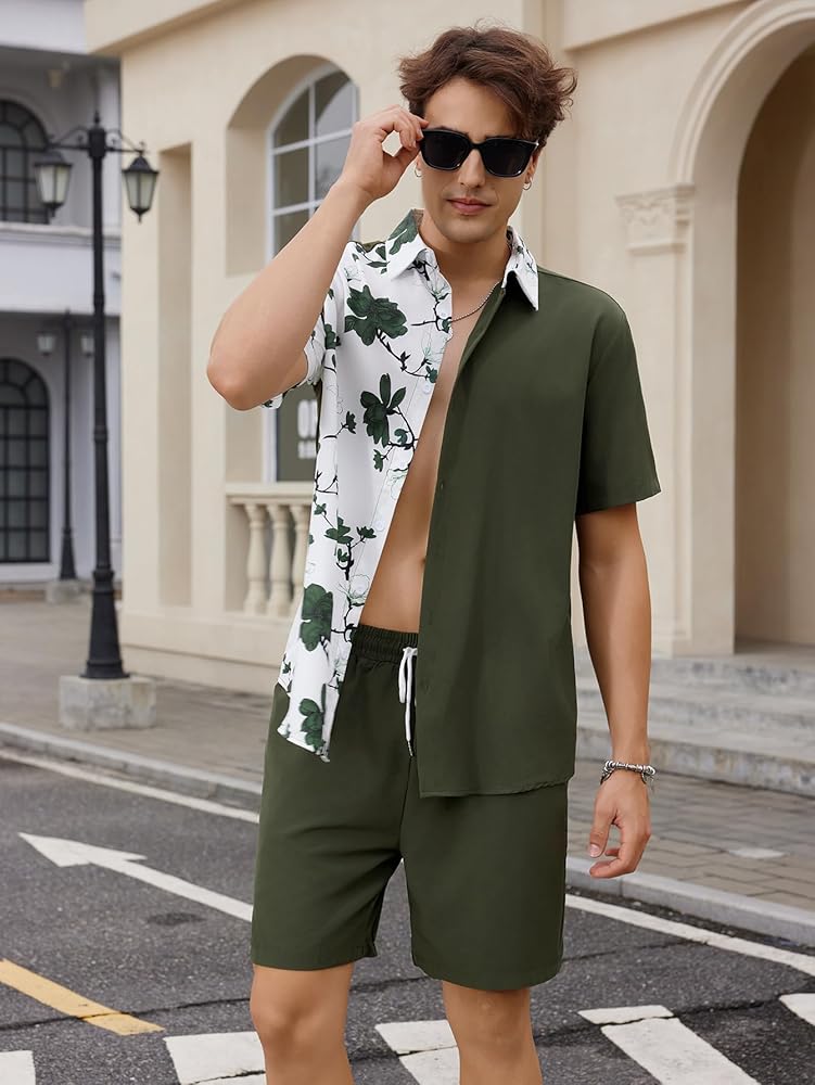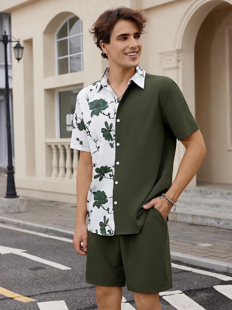 OYOANGLE Men's 2 Piece Vacation Outfits Tropical Hawaiian Button Down Shirt and Shorts Set
