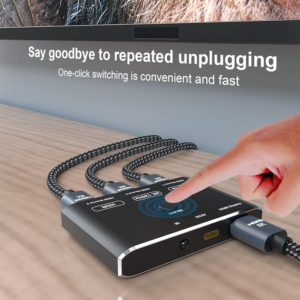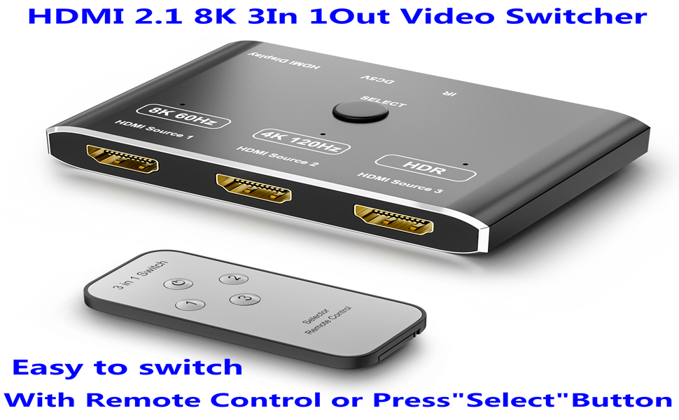 3 Port HDMI 2.1 Switch with Remote Control:While using this HDMI 2.1 3Port Switch,you can have two methods to switch between your three hdmi source devices.**1:Press"select"button in the switcher to swift,**2:Press"1""2""3"in the remore control to switch between your HDMI Source Devices,Note:you should press "Power"Symbol to turn on the switcher firstly.